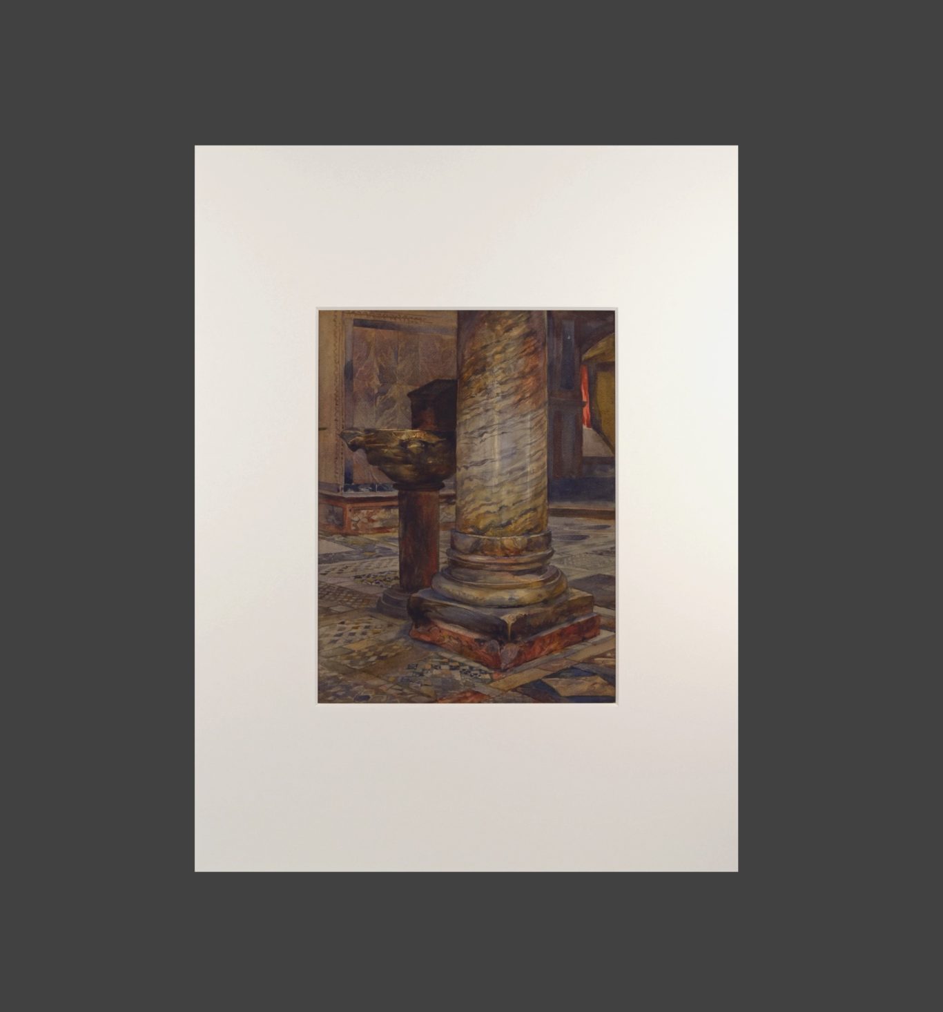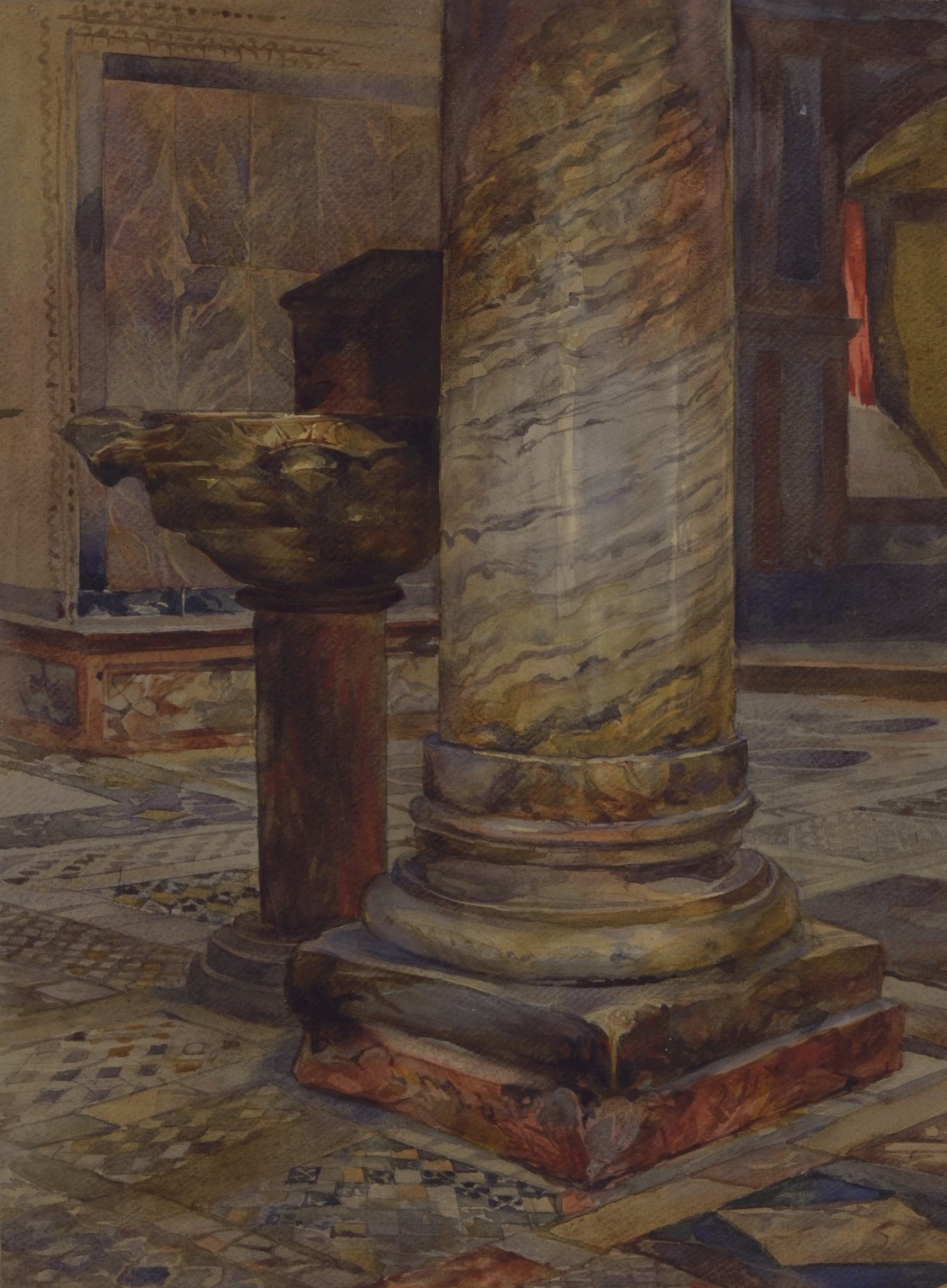 Adolf Schill, View of the Northern Transept in San Marco with a Column and a Byzantine Holy Water Font, 1886, watercolor, pen and gouache on paper, mounted on cardboard, 44.8 x 33.5 cm, not signed, unframed. From the artist’s estate.