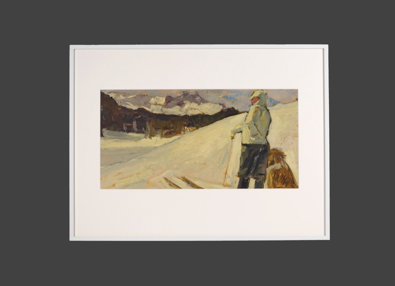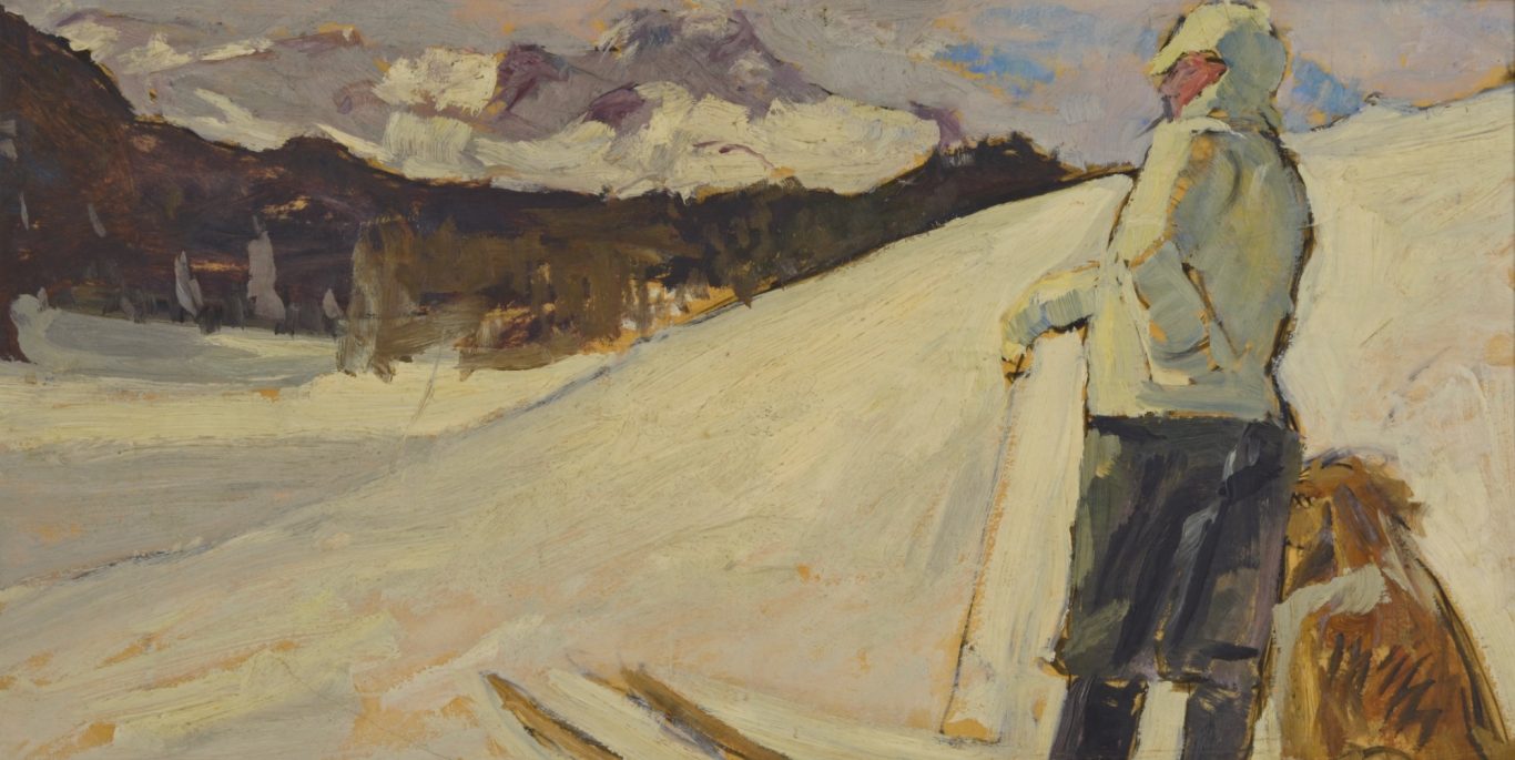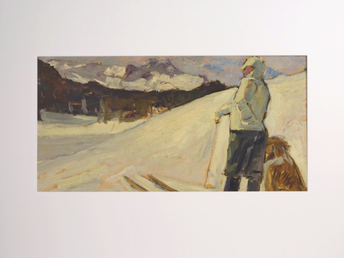 Albert Maennchen, A Skier with a Dog near St. Moritz, c. 1906/07, oil on paper, not signed, 35 x 66 cm, several smaller folds, parts with traces of usage and smaller missing parts at the margins.