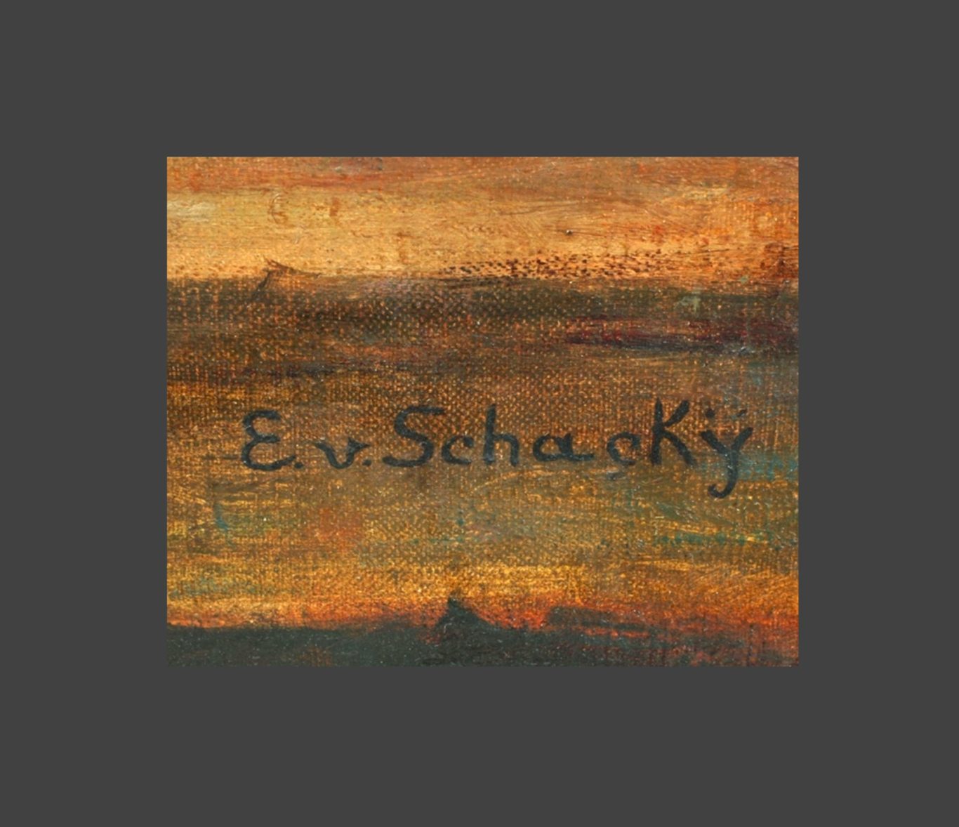 Hans Szym, Brandenburgian Landscape at Sunset, before 1929, oil on canvas, 52 x 72 cm, signed lower right “H Szymkowiak,” illegible stamps on the back of the stretcher, unframed. Condition: Two small missing areas in the lower center, one patch with retouching, otherwise good for its age.