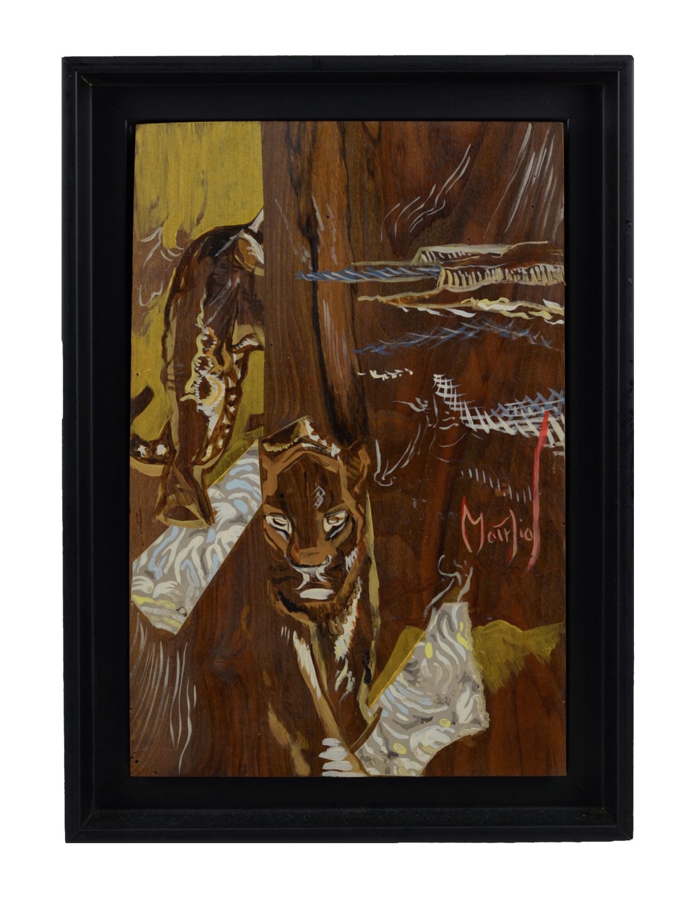 Grégoire Mathias, Panther, c. 2000, oil and gold bronze on precious wood panel, c. 32,7 x 22 cm, signed “Mathias” on the right, mounted in a black frame (39.5 x 28.5 cm). Marked “Panthere” and monogrammed “G. M.” on the reverse, as well as stamped “Mathias Grégoire.” Condition: very good.