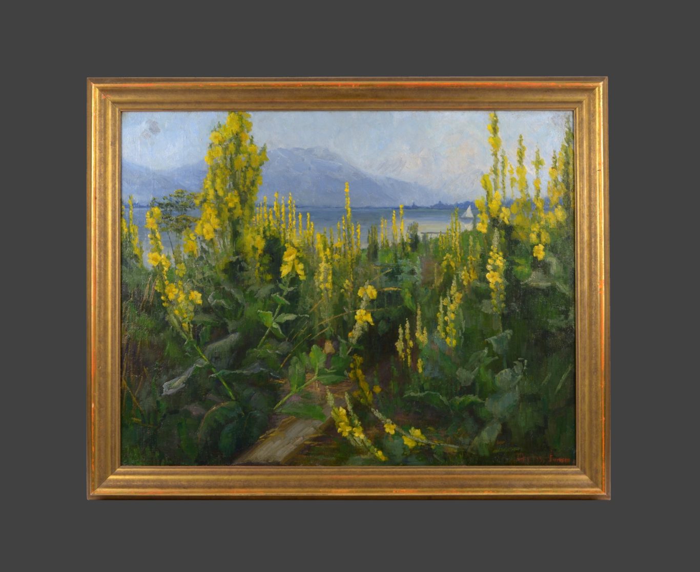 Helen Iversen, Königskerzen am Chiemsee, um 1900, Öl auf Leinwand, 60 x 75 cm, signiert unten rechts "Helen Iversen“, bezeichnet auf Rückseite „Helen Iversen / Charlottenburg Spandauerstr. 19 / Königskerzen am Chiemsee“ (Klebezettel oben), „Königskerzen am Chiemsee / Abt[ei] Fraueninsel“ (Klebezettelfragment unten) sowie diverse Händlerbeschriftungen und Auktionsnummern, gerahmt (71 x 86.5 cm).