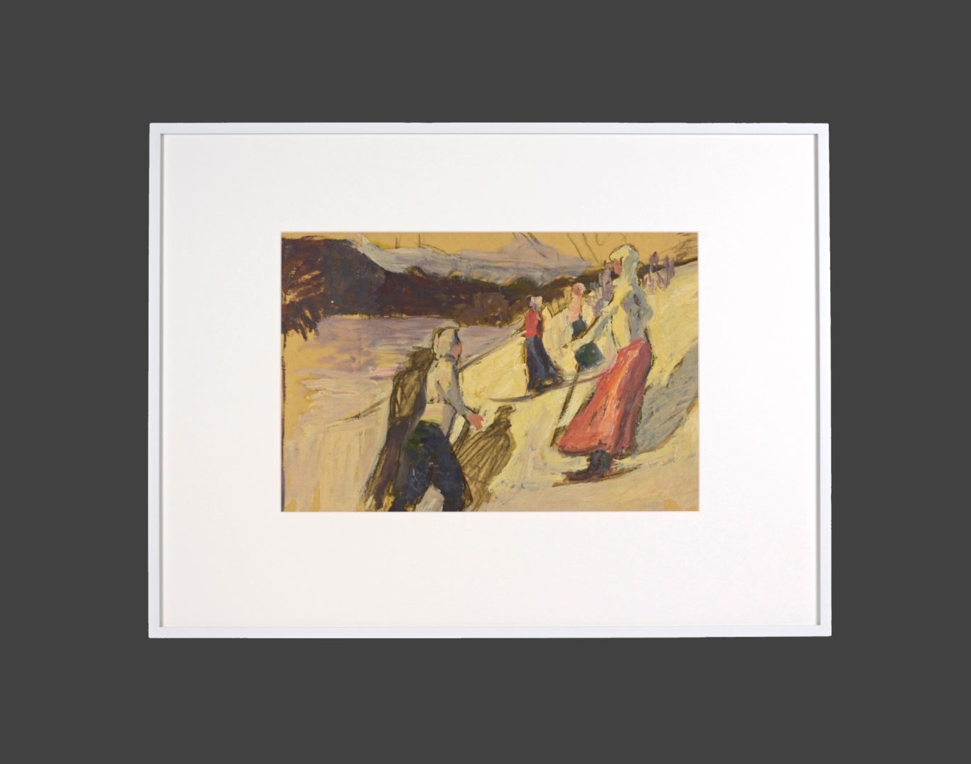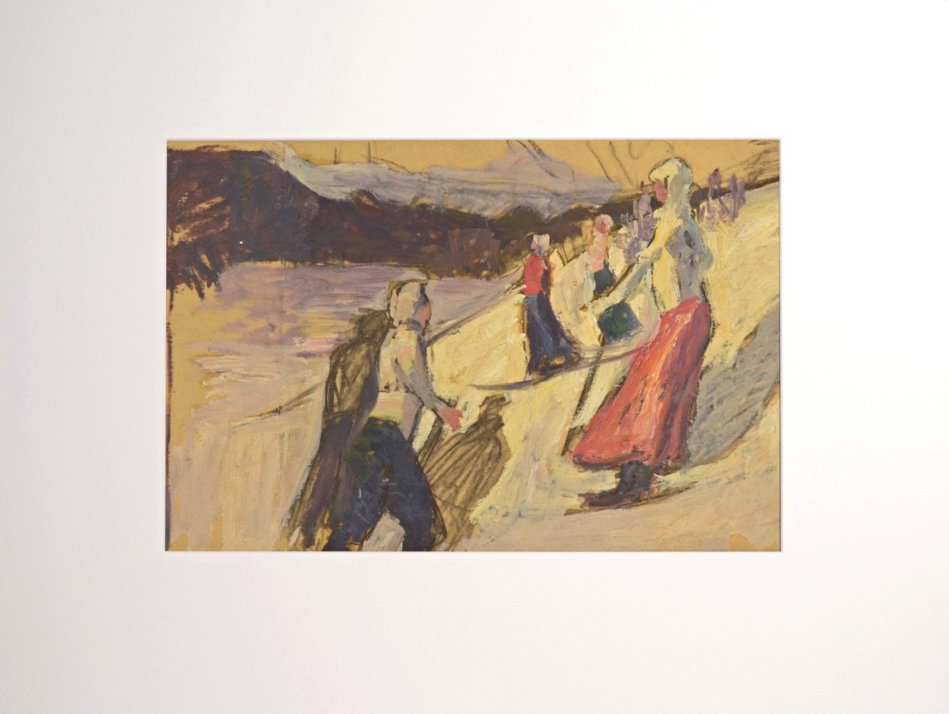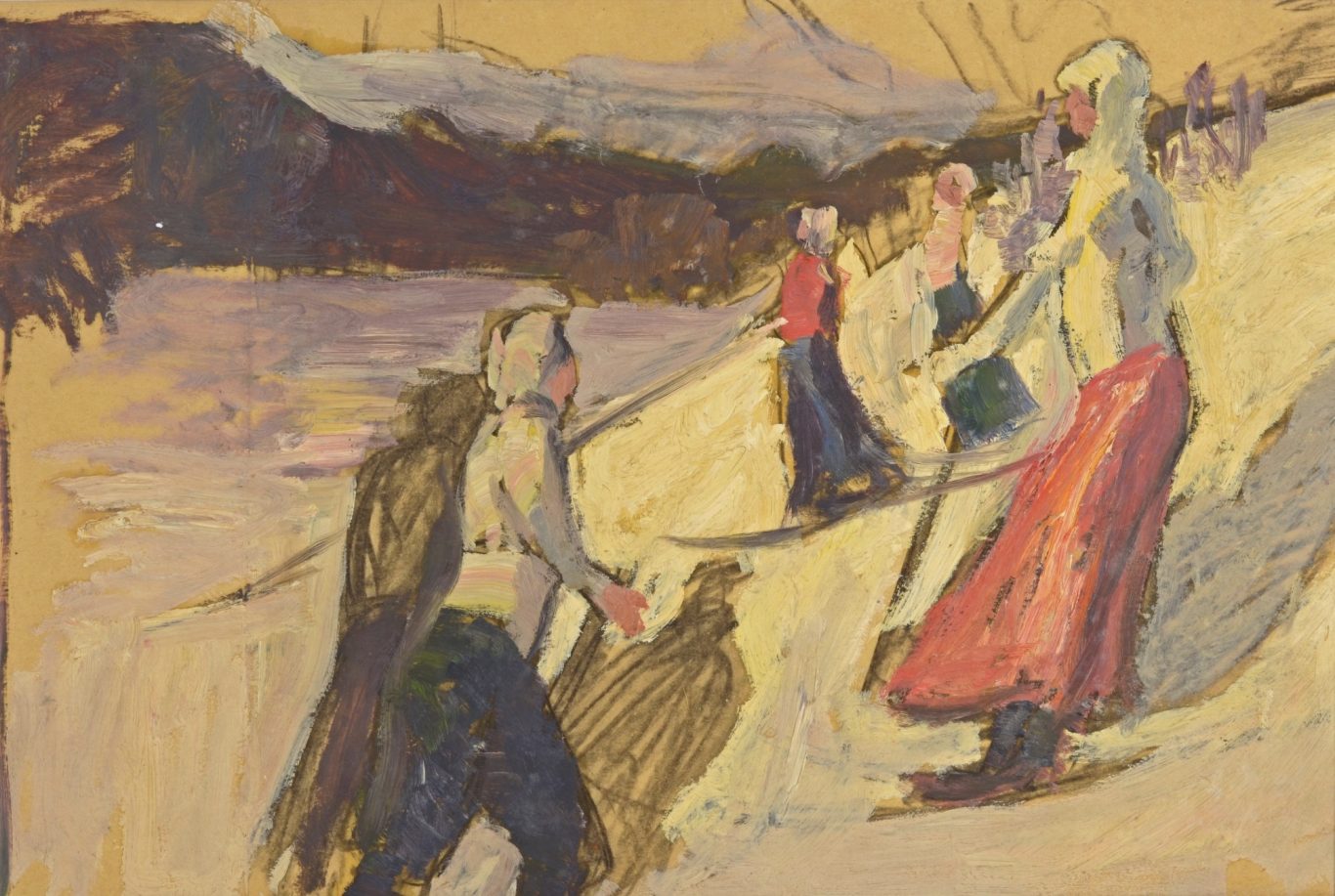 Albert Maennchen, Female and Male Skiers near St. Moritz, c. 1906/07, oil on paper, not signed, 34 x 67 cm, several smaller folds, parts with traces of usage and smaller missing parts at the margins.