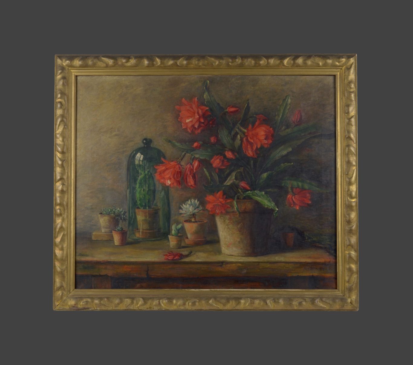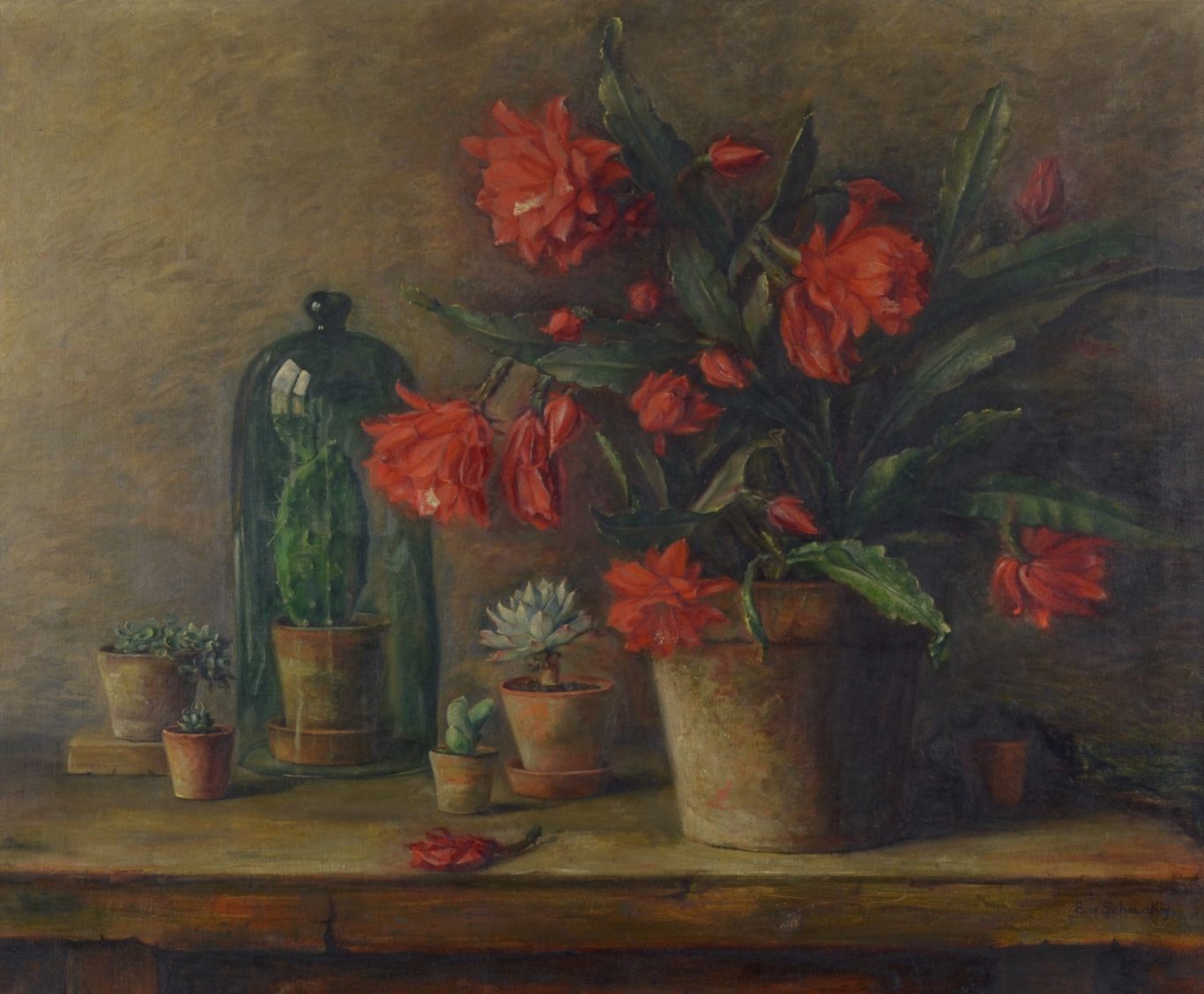 Eugenie von Schacky, Cacti, 1925, oil on canvas, 65 x 80 cm, signed lower right "E. von Schacky", verso on the frame a label inscribed with “E. v. Schacky / Kakteen” and a label in Art Nouveau style of the frame shop “Emil Plesko / Vergolder / München / Barerstrasse 67 / Anfertigung von Ausstellungsrahmen / Kirchliche Kunst: / Renovierungen etc.“, framed (77 x 90.5 cm).