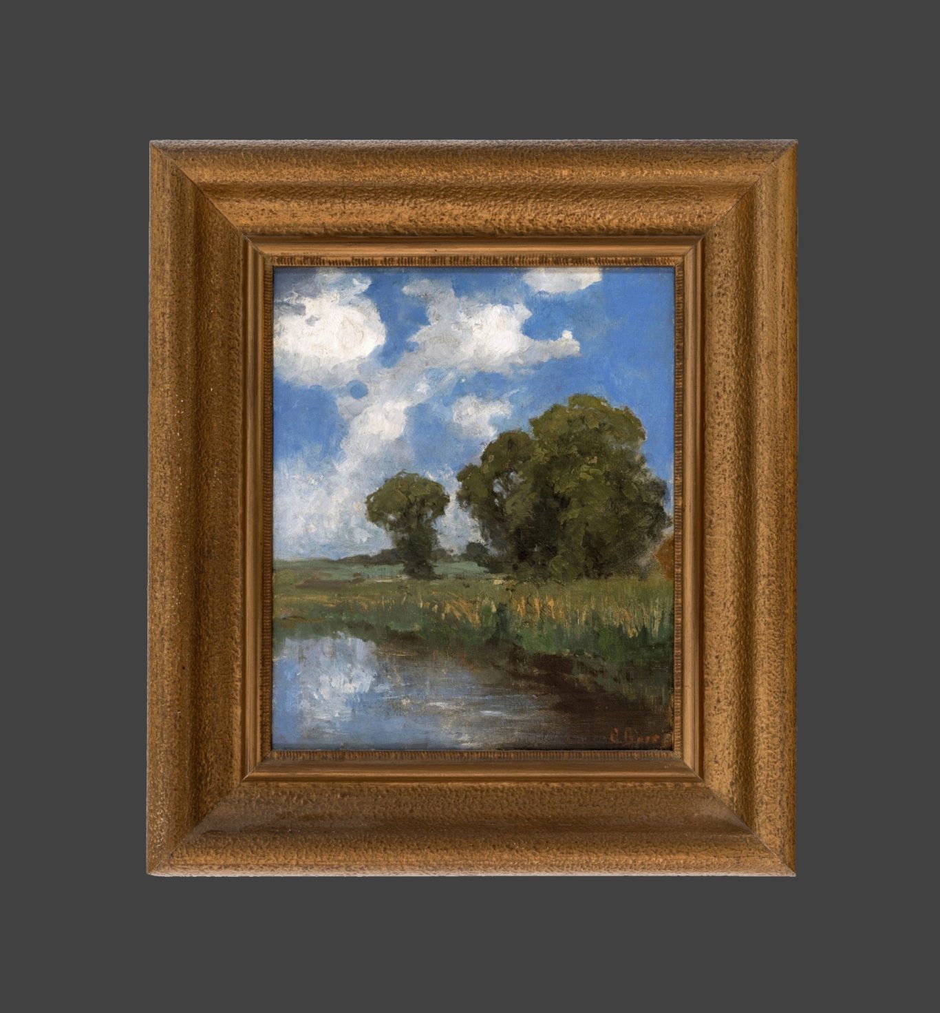Carola Baer-von Mathes, Meadow Creek, c. 1900, oil on wood, mounted on cardboard, signed lower right "C. Baer", framed (51 x 45 cm), on the backside a label of the Galerie am Isartor and further non-identifiable letters and figures.