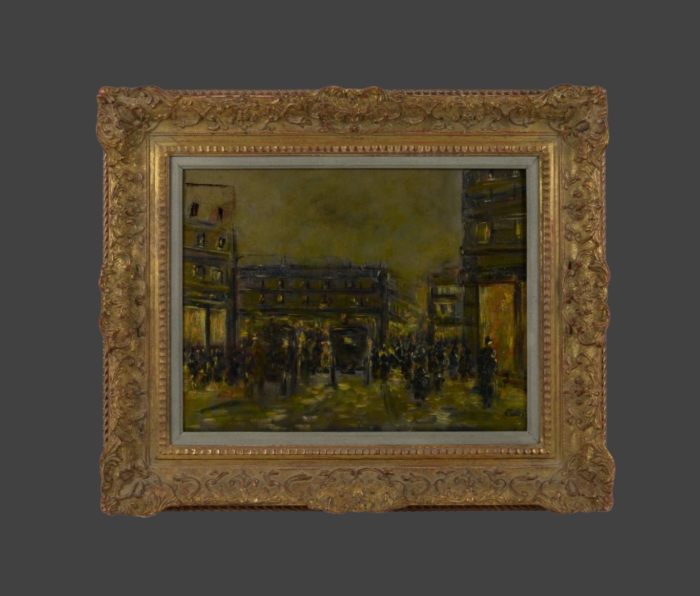 Antal Berkes, Paris. Rue du Louvre am Abend, um 1910, Öl auf Malkarton, signiert unten rechts "ABerkes", 33 x 43.3 cm, gerahmt, bezeichnet auf Rückseite „Paris. Rue du Louvre“ sowie die Lebensdaten des Künstlers und diverse Auktionshinweise.