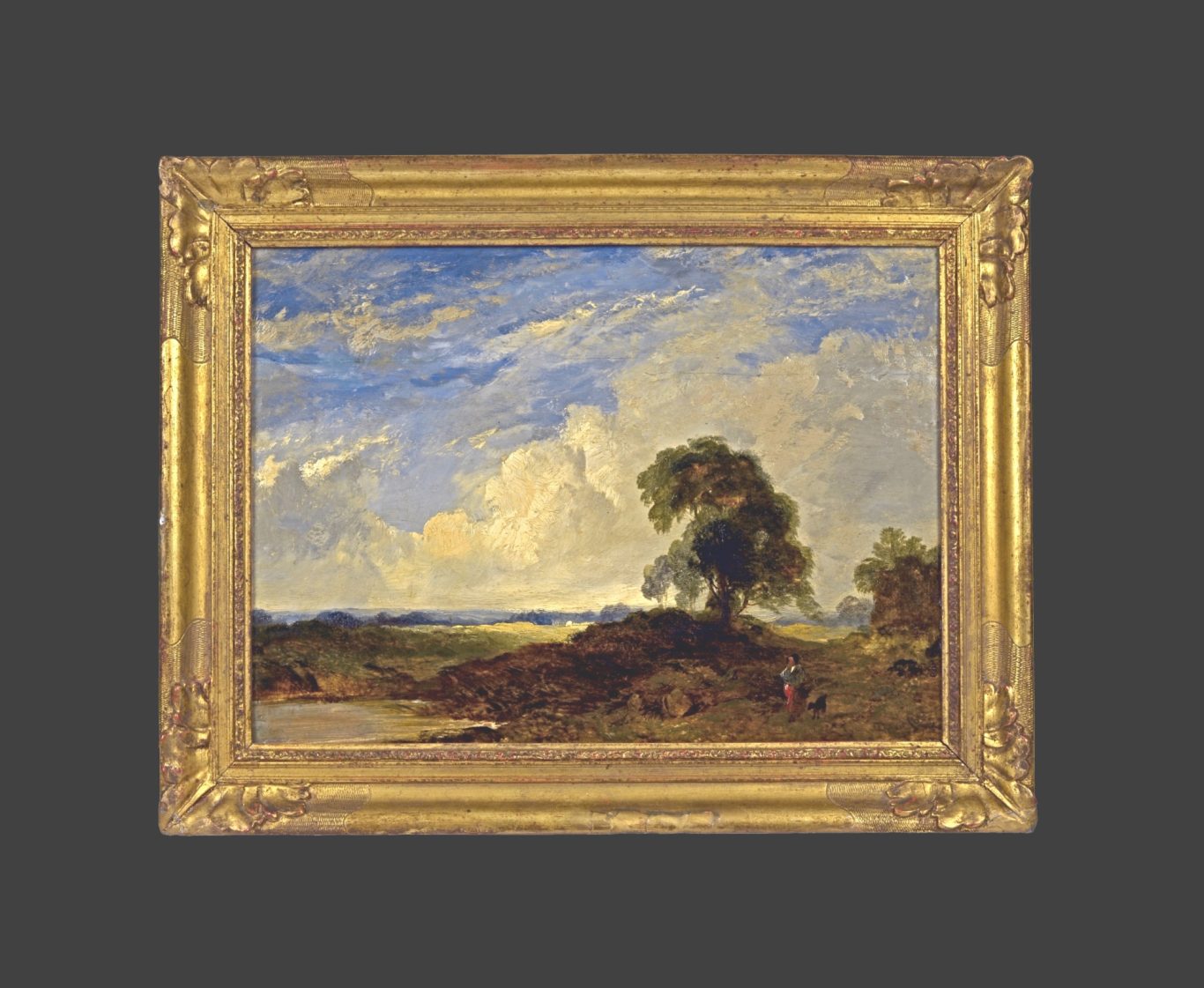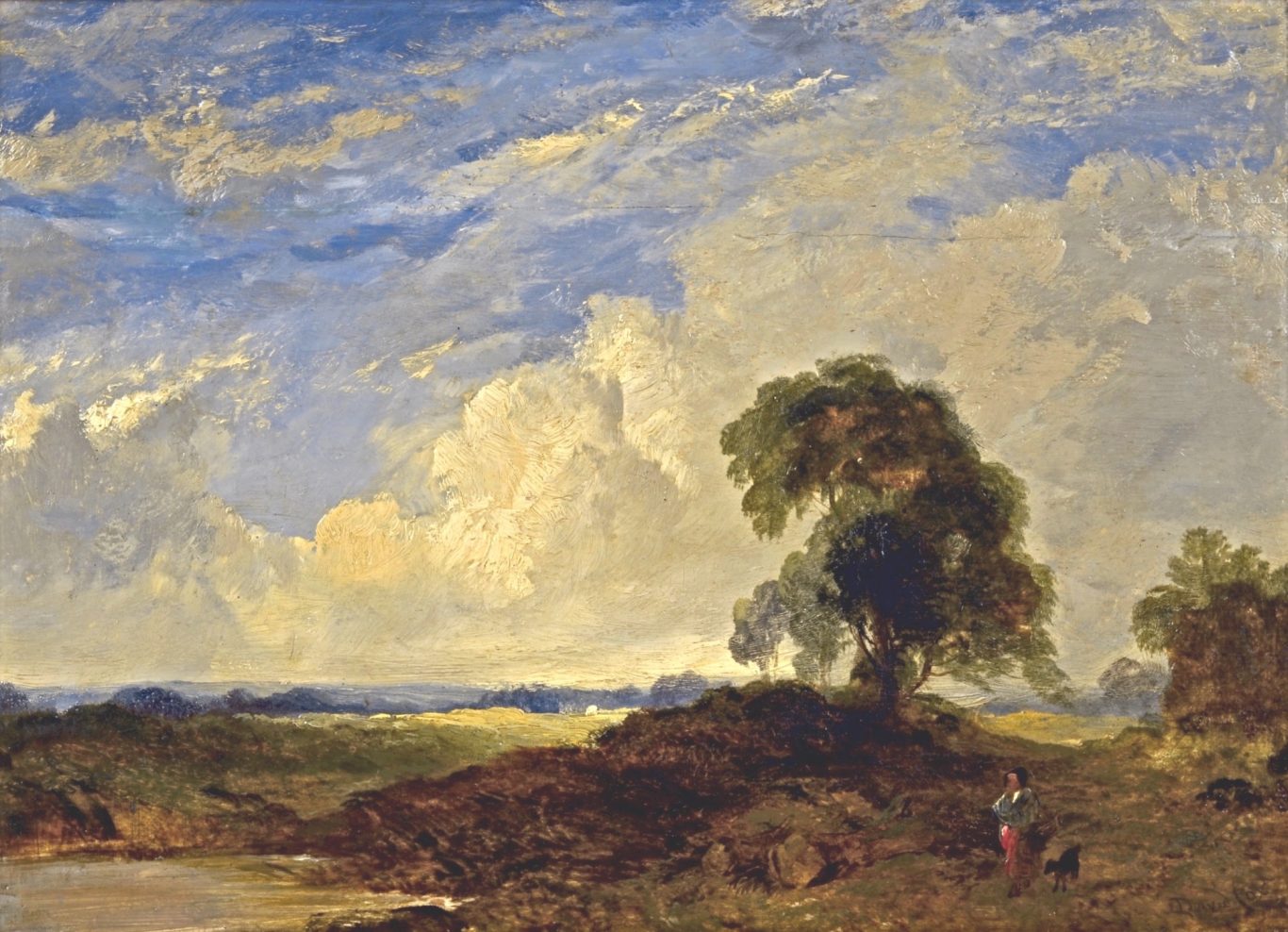 David Cox d. Ä., Weite Landschaft mit Frau und Hund an einem Teich vor dramatischer Wolkenkulisse, um 1840/50, Öl auf Holz, 30 x 41 cm, signiert unten rechts „David Cox“, gerahmt (38 x 49.5 cm), restaurierter Riss mit rückseitigen Holzverstärkungen.