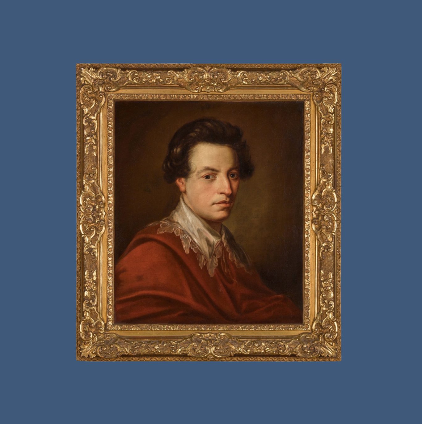 Angelika Kauffmann, Porträt Alexander Gordon, 4th Duke of Gordon, um 1770, Öl auf Leinwand, 54 x 45.2 cm, unsigniert, doubliert, teilweise retuschiert, sehr schöner Rahmen des 19. Jahrhunderts (70.7 x 63.1 cm). Auf der Rückseite am Keilrahmen bezeichnet „449/53“, „R. Menas [?]“, „Ehrmann“ und mit altem Klebezettel „Nr 7 Engliches [sic] Porträt eines jungen Mannes“ versehen.