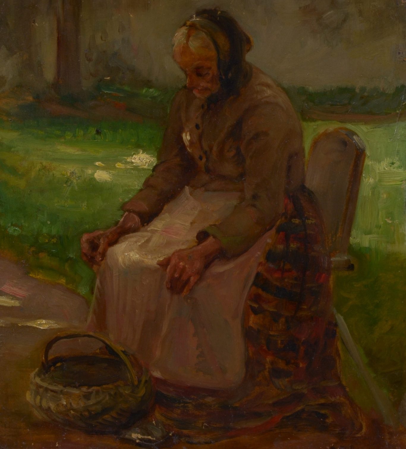 Emil Keyser, Sitzende alte Bäuerin mit Korb, um 1900