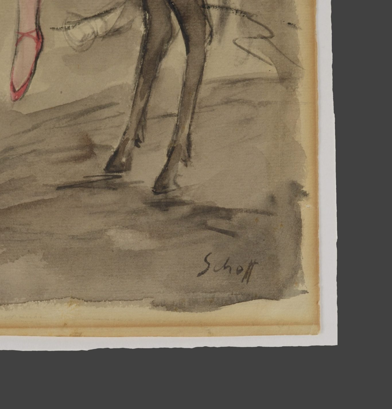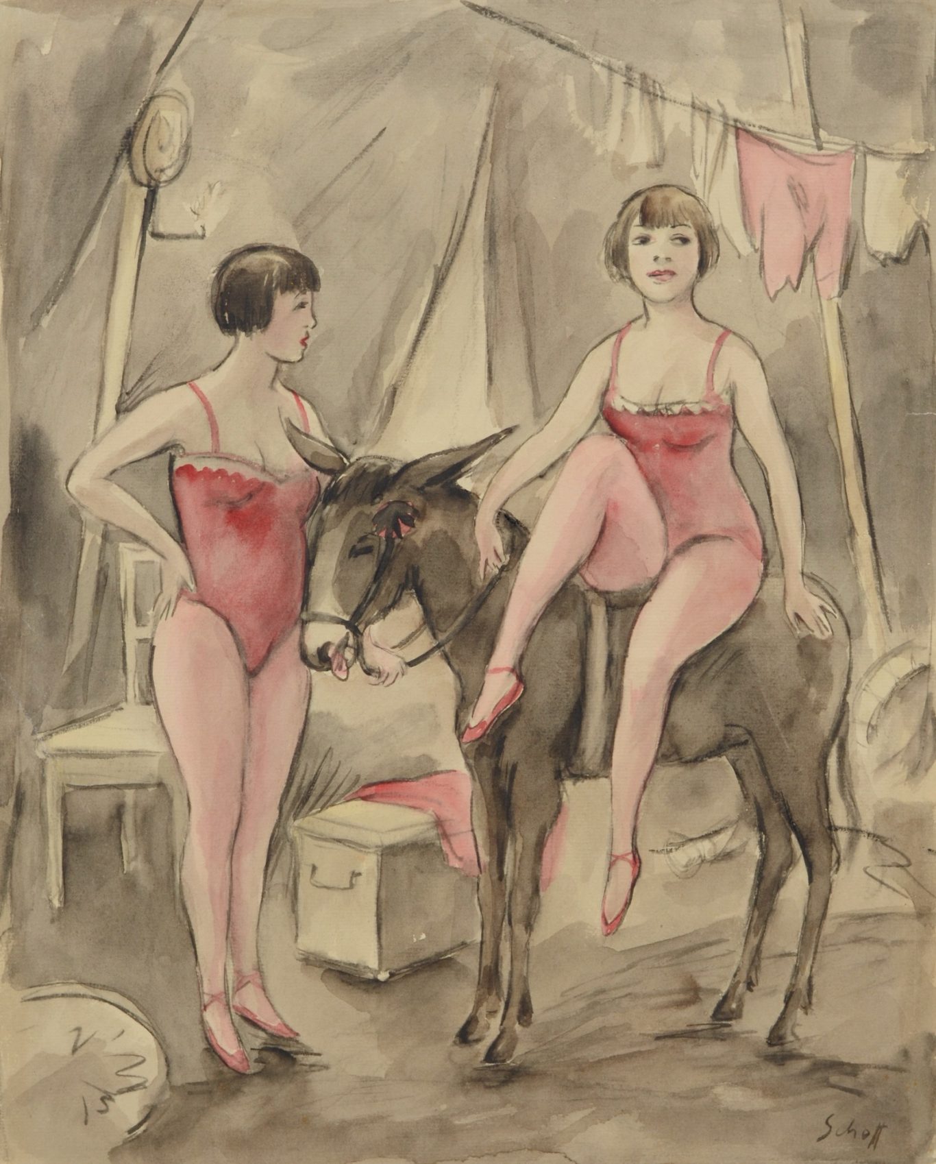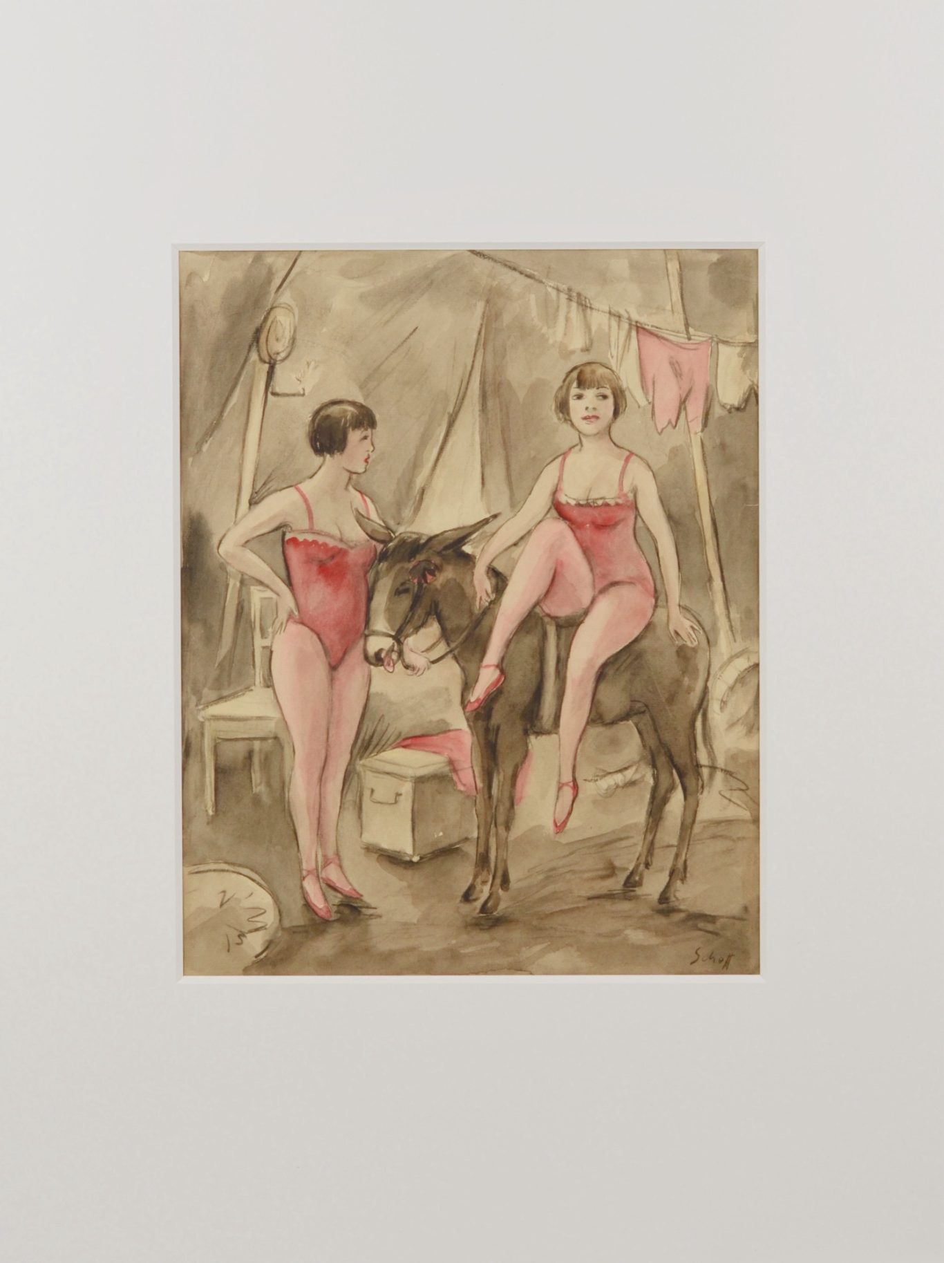 Otto Schoff, Two Female Circus Performers with a Donkey, c. 1920, watercolor on paper, 37.1 x 29.8 cm, signed lower right “Schoff,” handwritten dealer's mark on the reverse, mounted on cardboard at the top. Condition: Small tears at the edges, browned at the edges, otherwise good.