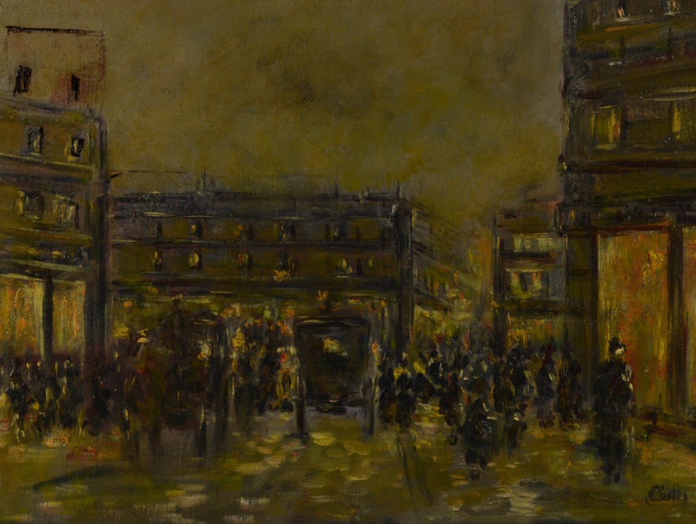 Antal Berkes, Paris. Rue du Louvre in the Evening, c. 1910, oil on cardboard, signed lower right "ABerkes", 33 x 43.3 cm, framed, inscribed (verso) i. a. “Paris. Rue du Louvre”.