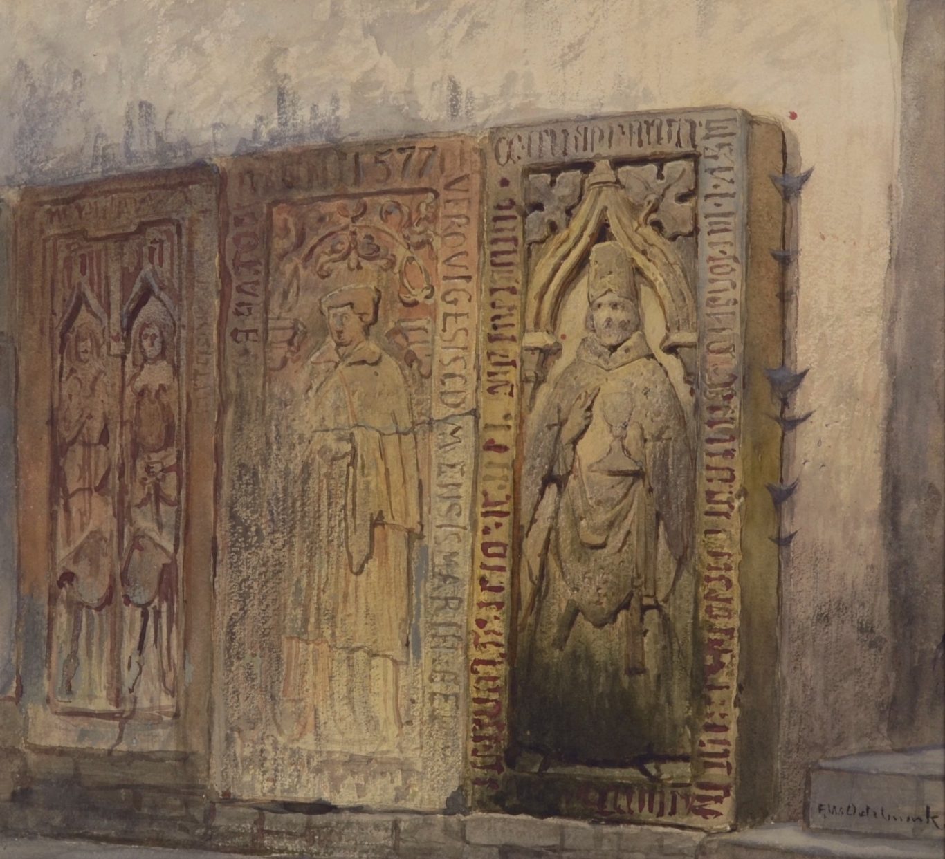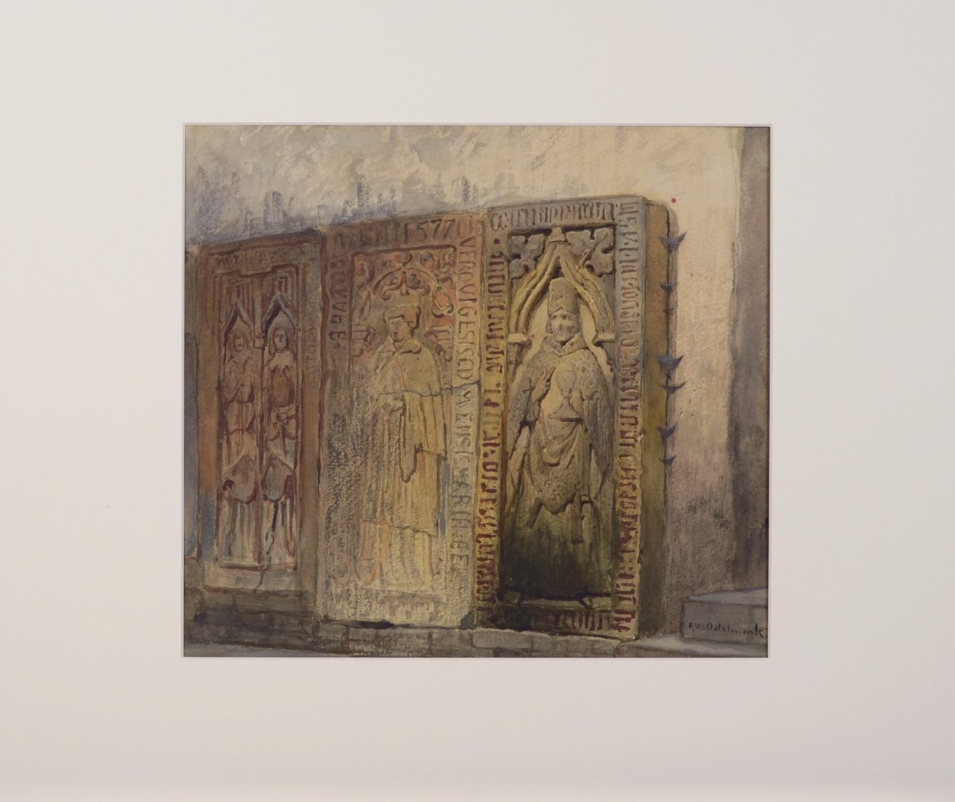 Frans Wilhelm Odelmark, Grabplatten an einer Kirchenwand, um 1870/80, Aquarell auf Papier, 33 x 36 cm, signiert, signiert unten rechts „F.W.Odelmark“, ungerahmt.