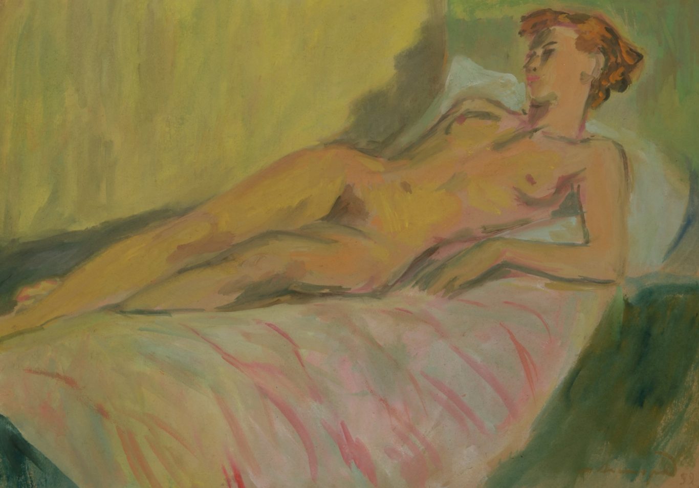 Meyer Axelrod, Female Reclining Nude, 1959, watercolor and gouache on cardboard, 52.5 x 74 cm, signed and dated lower right, handwritten inscription in Belarusian on the reverse. Condition: Pinholes in the corners and edge damage, otherwise good.