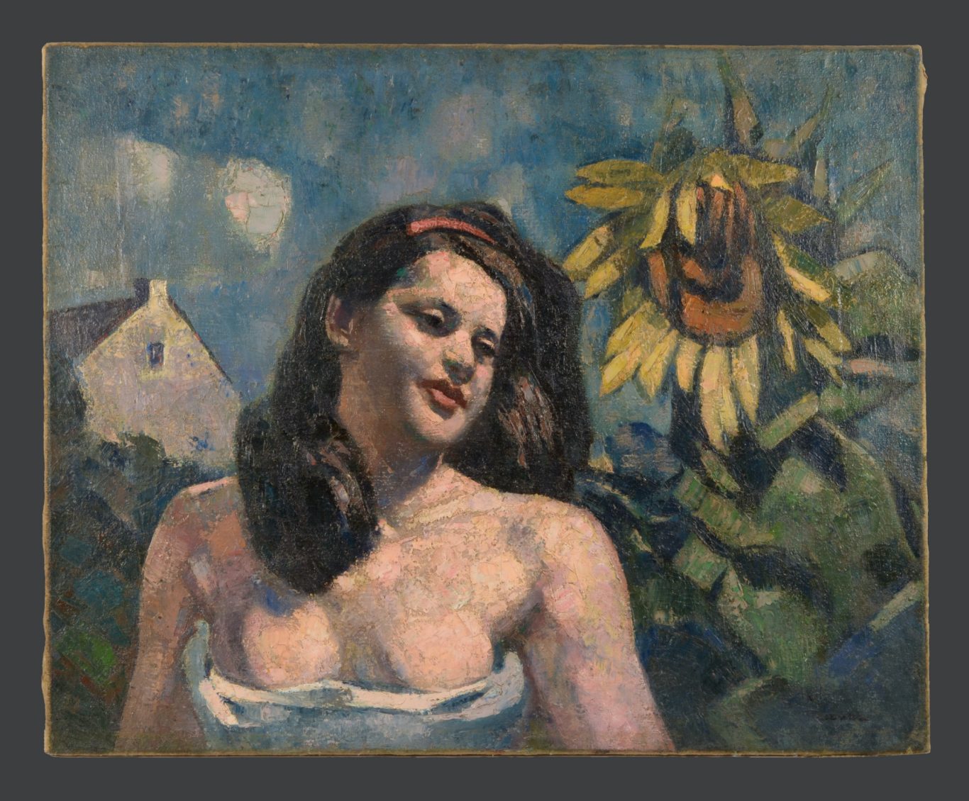 Franz Giessel, Young Woman in the Garden with a Sunflower, a House in the Background, c. 1970, oil on canvas, 85 x 100 cm,