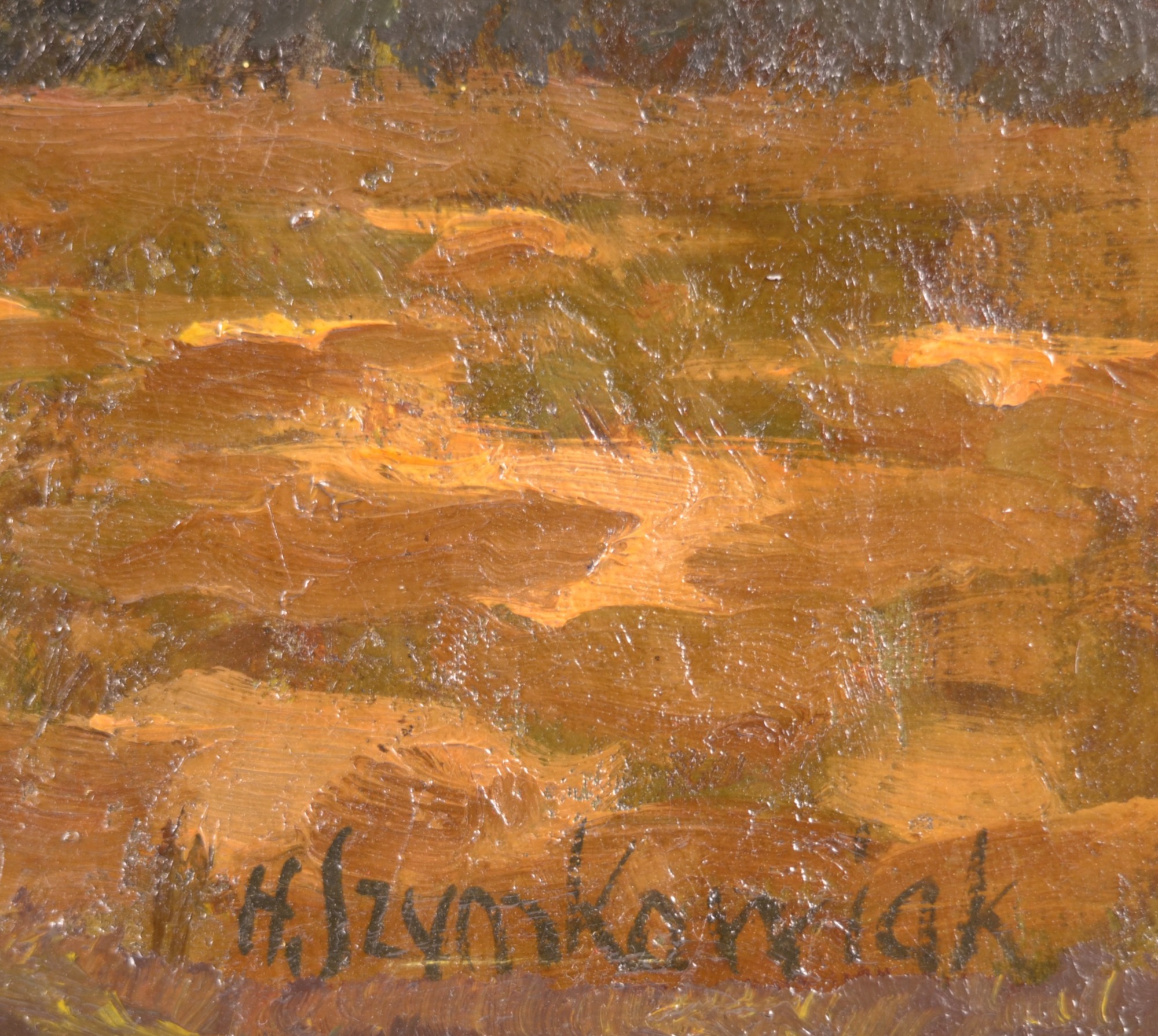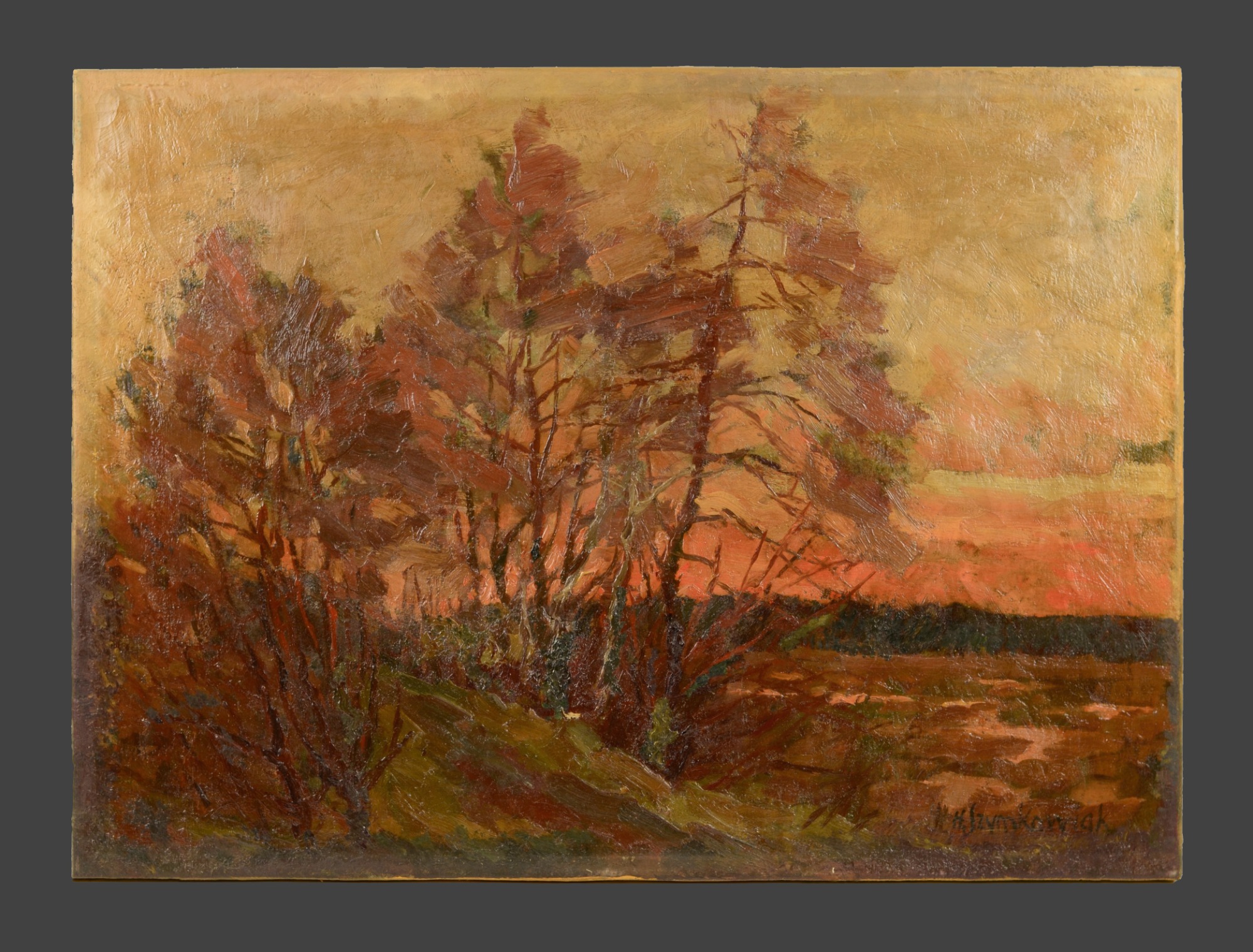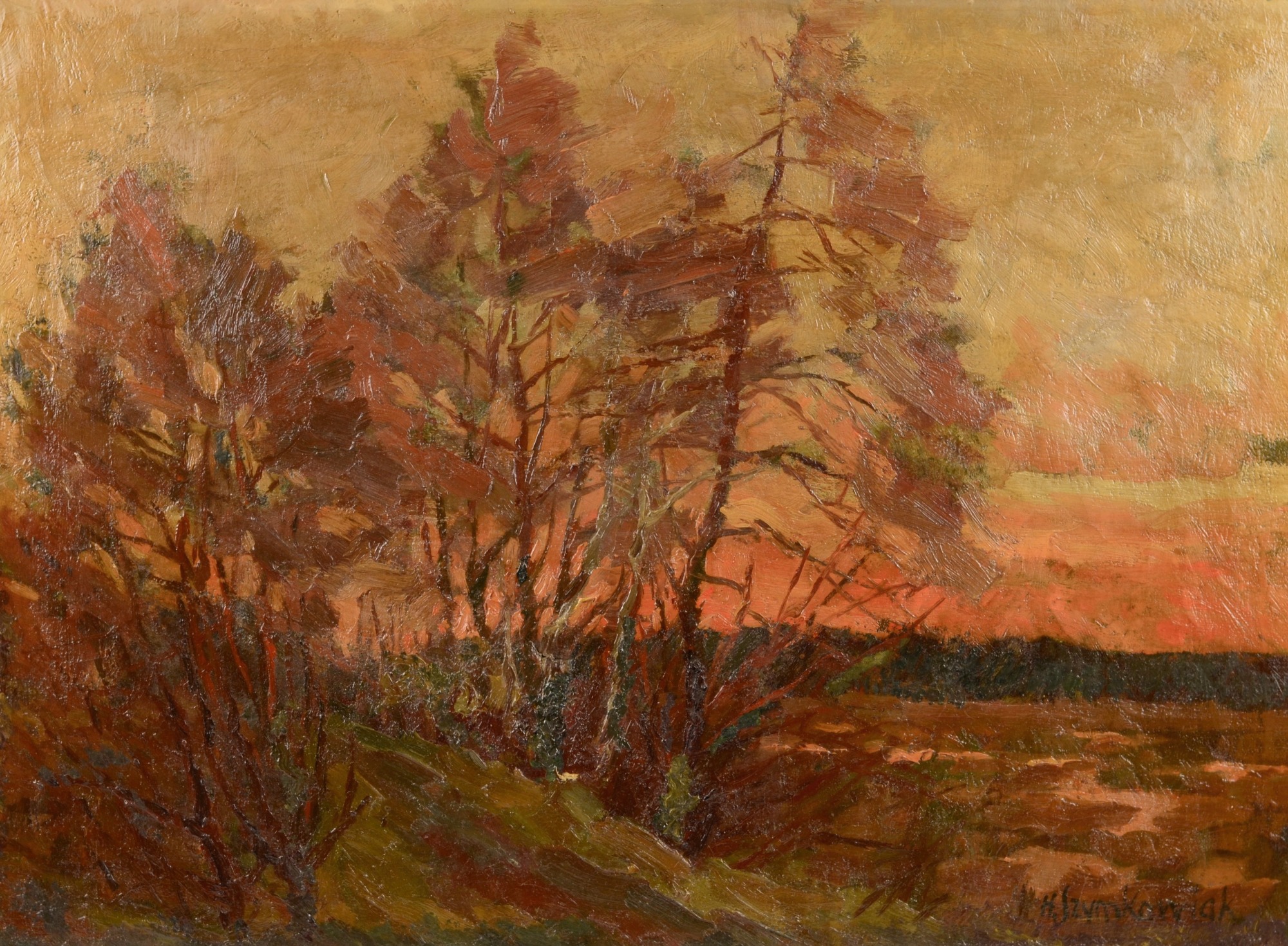 Hans Szym, Brandenburgian Landscape at Sunset, before 1929, oil on canvas, 52 x 72 cm, signed lower right “H Szymkowiak,” illegible stamps on the back of the stretcher, unframed. Condition: Two small missing areas in the lower center, one patch with retouching, otherwise good for its age.