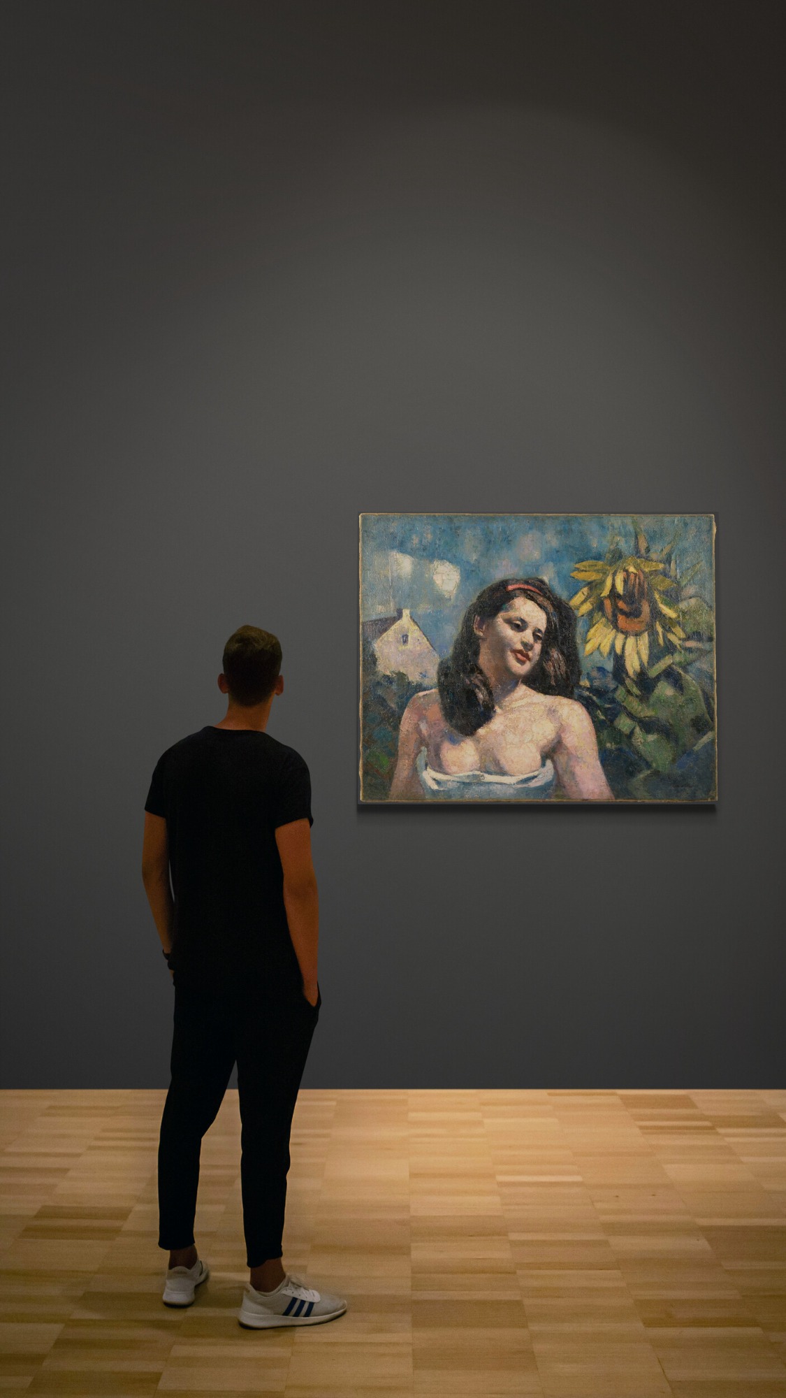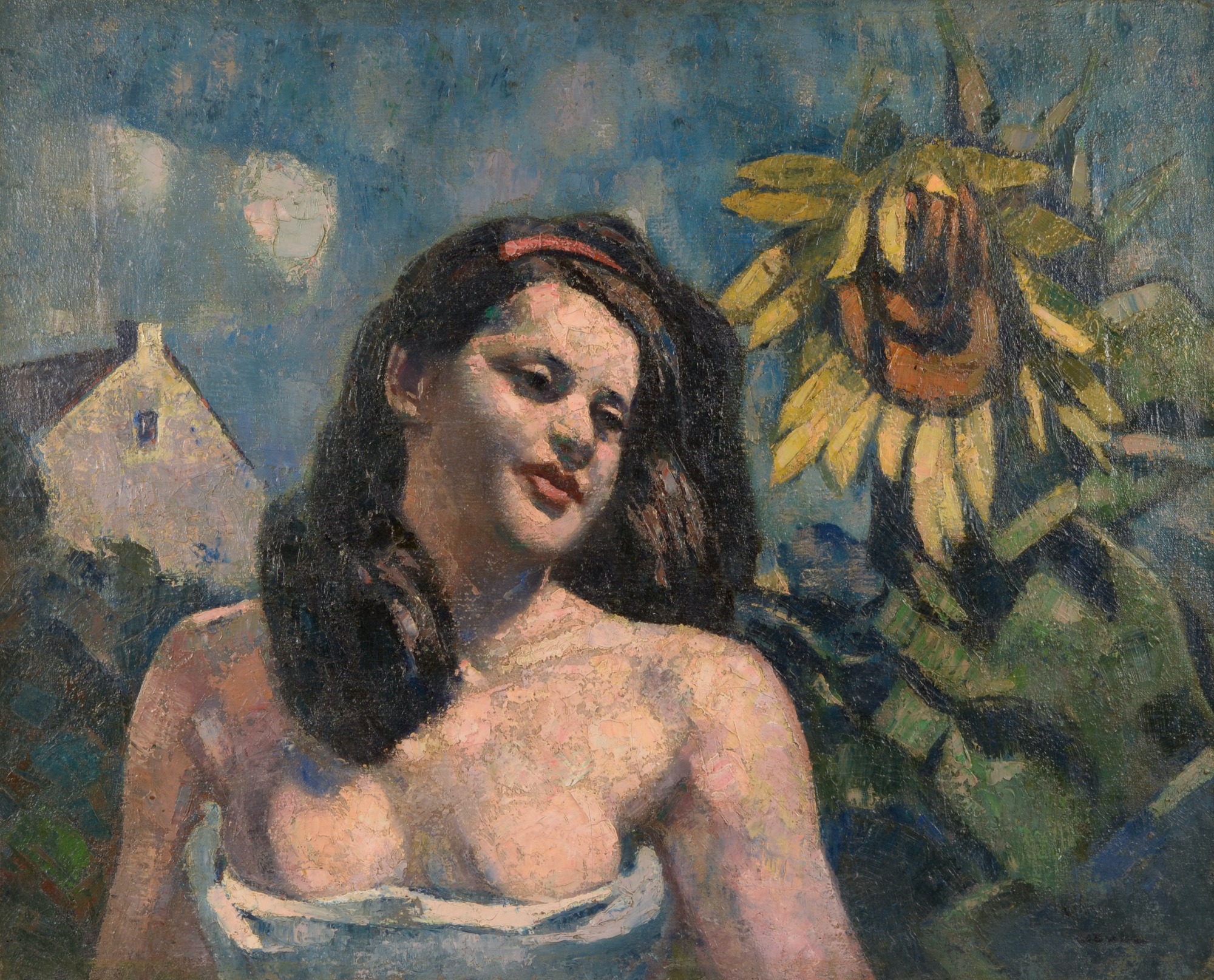 Franz Giessel, Young Woman in the Garden with a Sunflower, a House in the Background, c. 1970, oil on canvas, 85 x 100 cm,