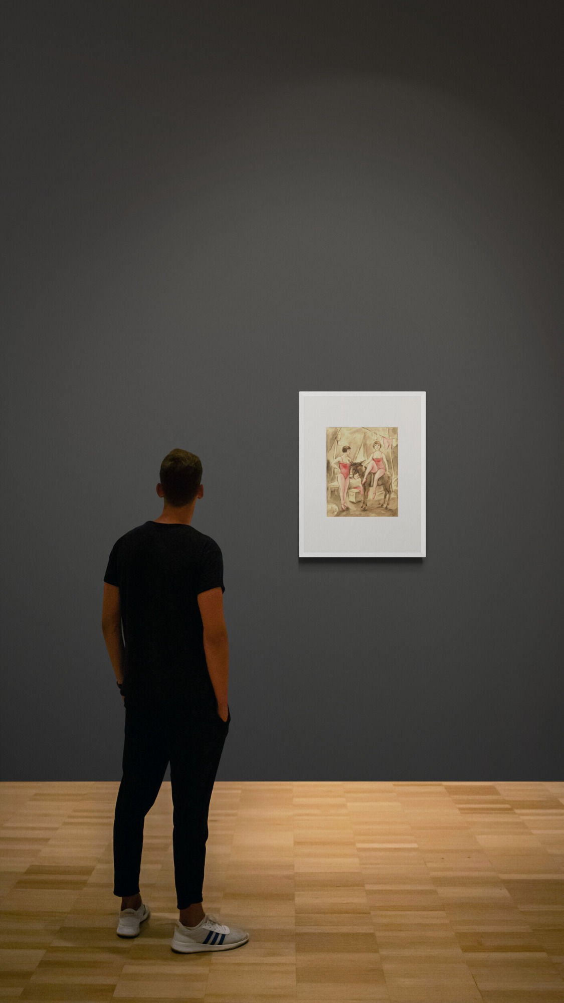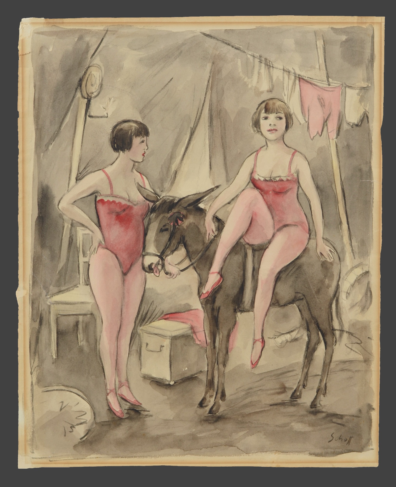 Otto Schoff, Two Female Circus Performers with a Donkey, c. 1920, watercolor on paper, 37.1 x 29.8 cm, signed lower right “Schoff,” handwritten dealer's mark on the reverse, mounted on cardboard at the top. Condition: Small tears at the edges, browned at the edges, otherwise good.