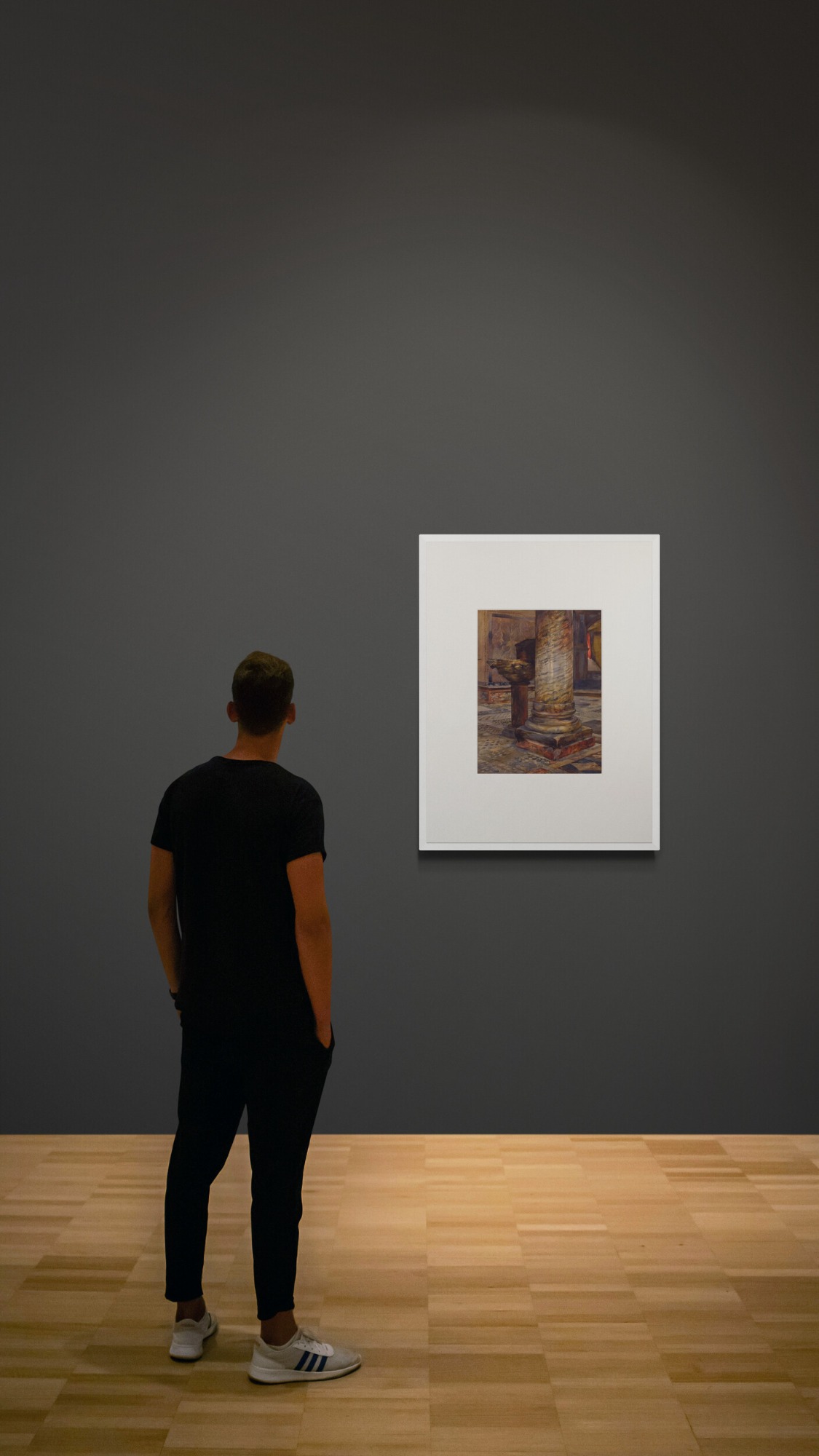 Adolf Schill, View of the Northern Transept in San Marco with a Column and a Byzantine Holy Water Font, 1886, watercolor, pen and gouache on paper, mounted on cardboard, 44.8 x 33.5 cm, not signed, unframed. From the artist’s estate.