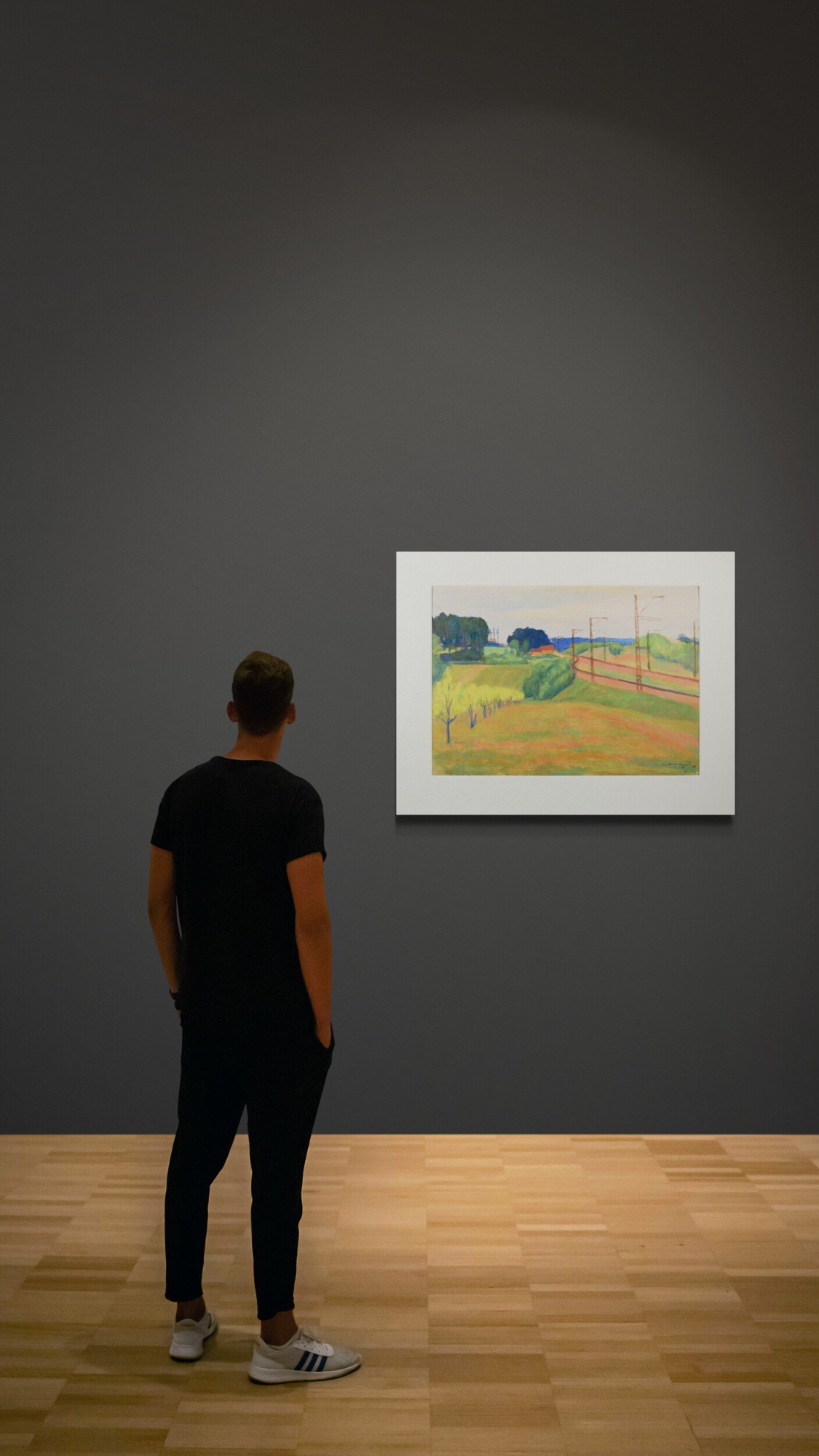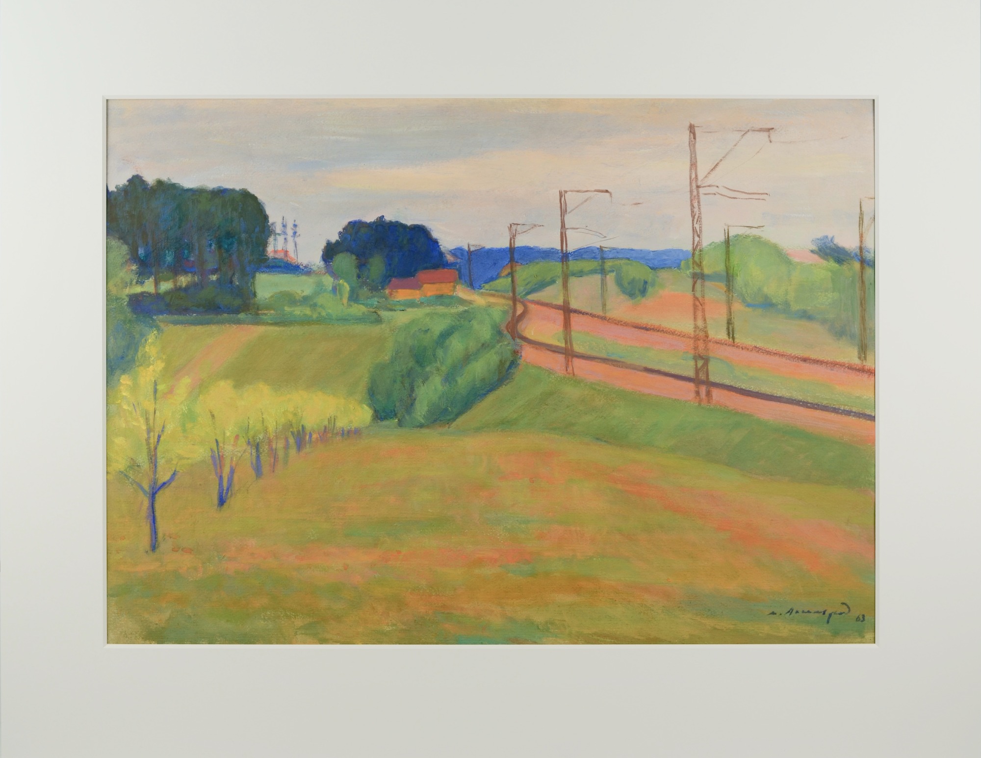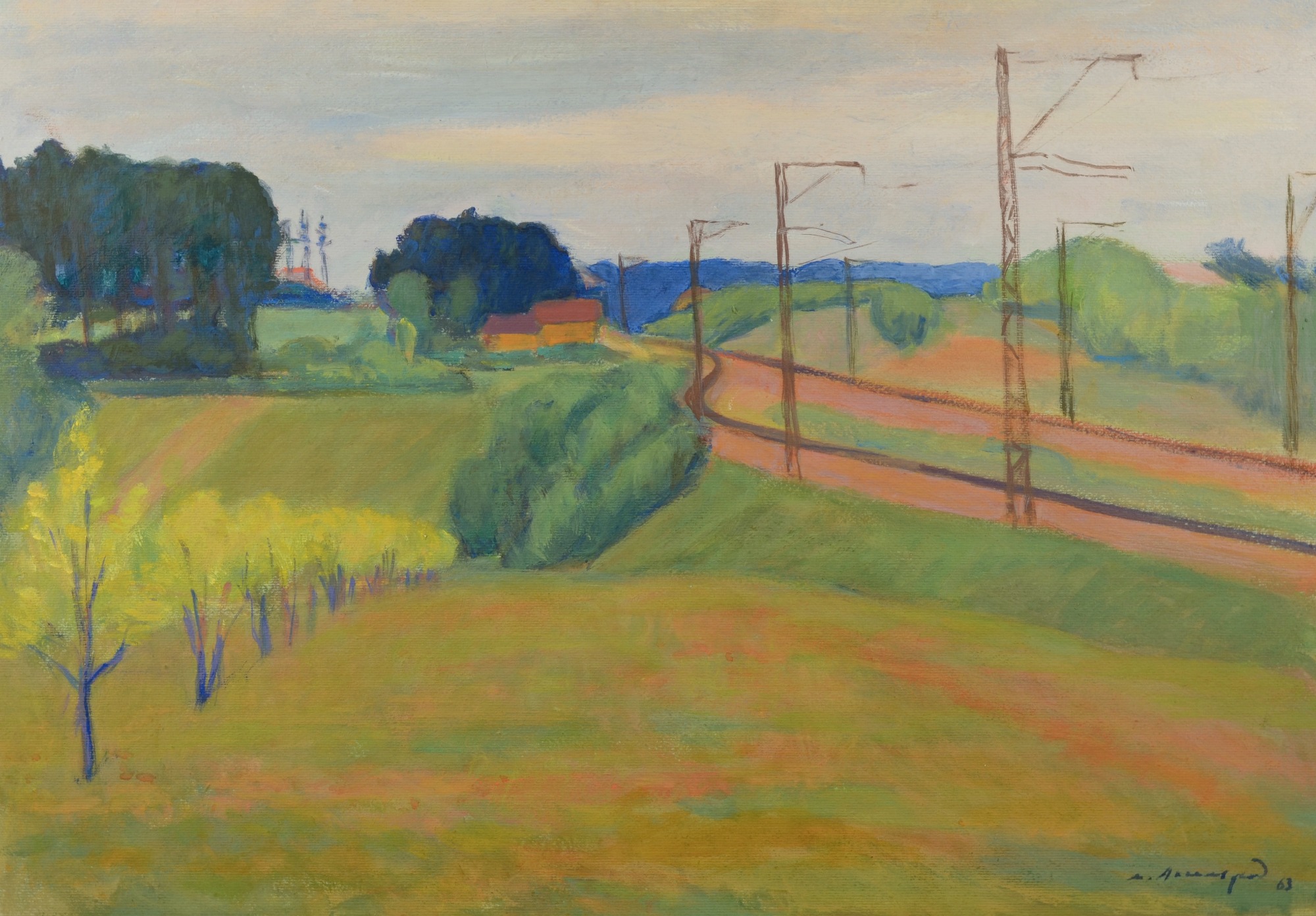 Meyer Axelrod, Landscape with Railway Track, 1963, oil on cardboard, 55.2 x 74 cm, signed and dated lower right, handwritten inscription in Belarusian on the reverse. Condition: pinholes in the corners, overall good.