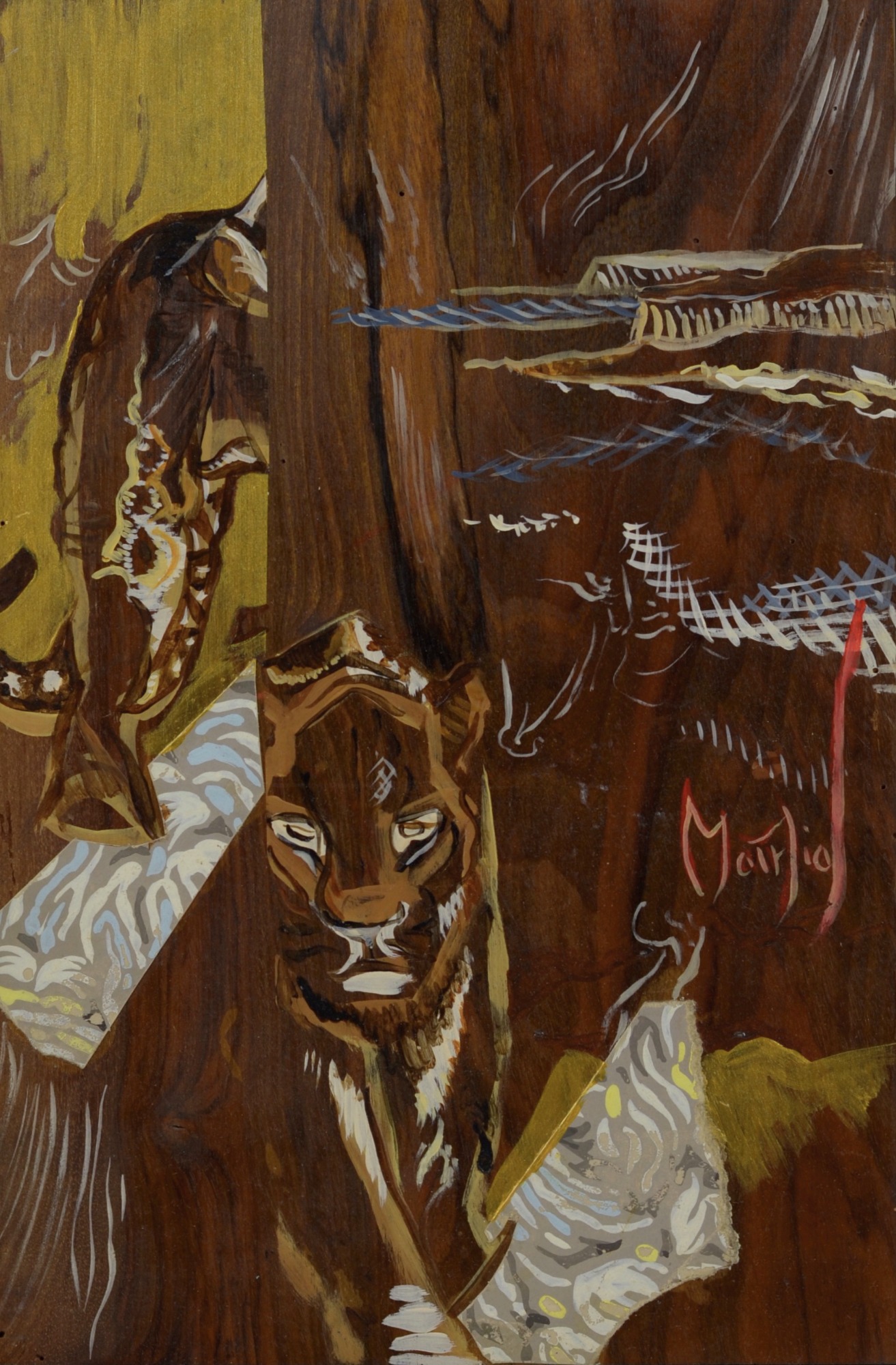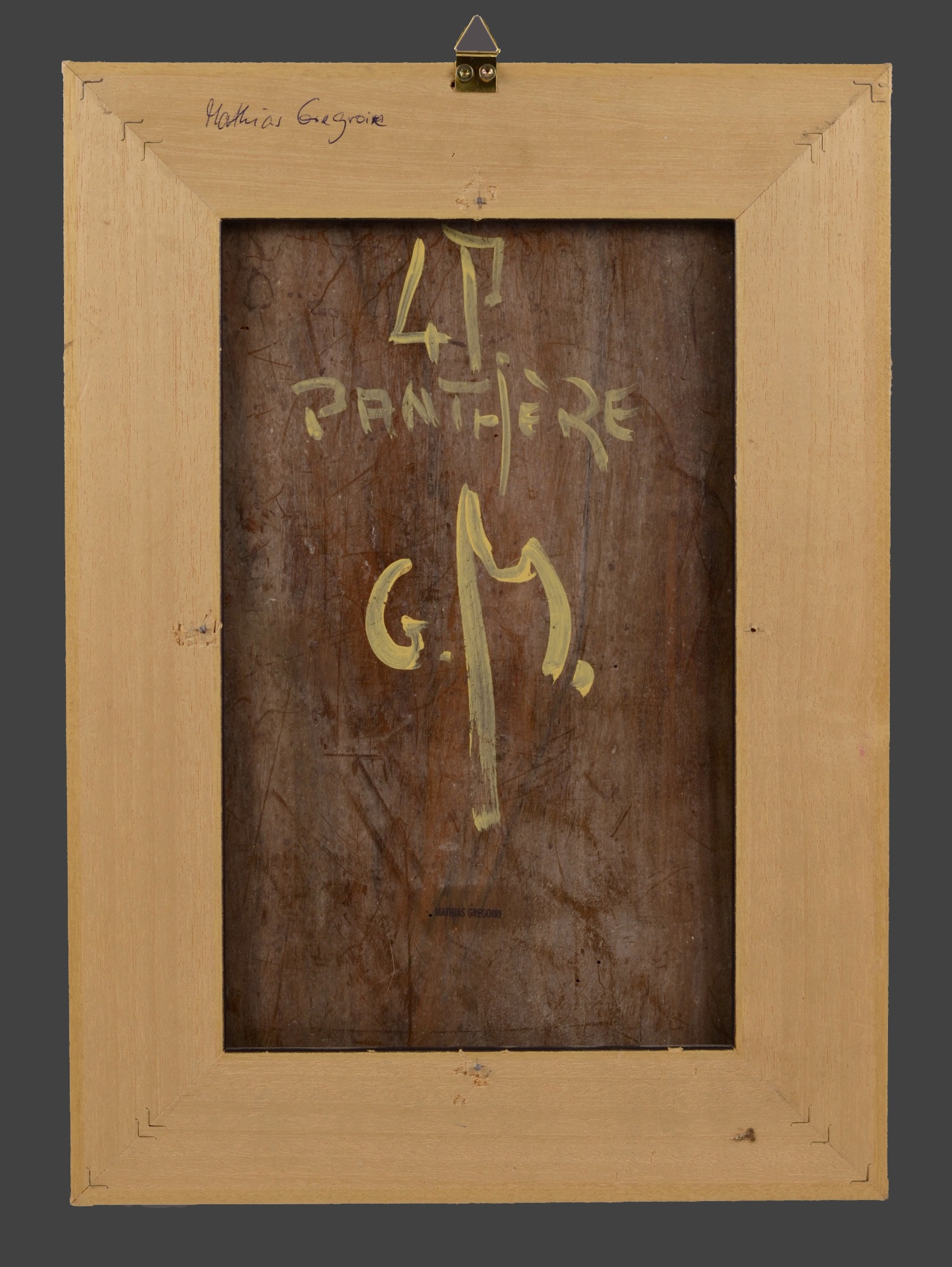 Grégoire Mathias, Panther, c. 2000, oil and gold bronze on precious wood panel, c. 32,7 x 22 cm, signed “Mathias” on the right, mounted in a black frame (39.5 x 28.5 cm). Marked “Panthere” and monogrammed “G. M.” on the reverse, as well as stamped “Mathias Grégoire.” Condition: very good.