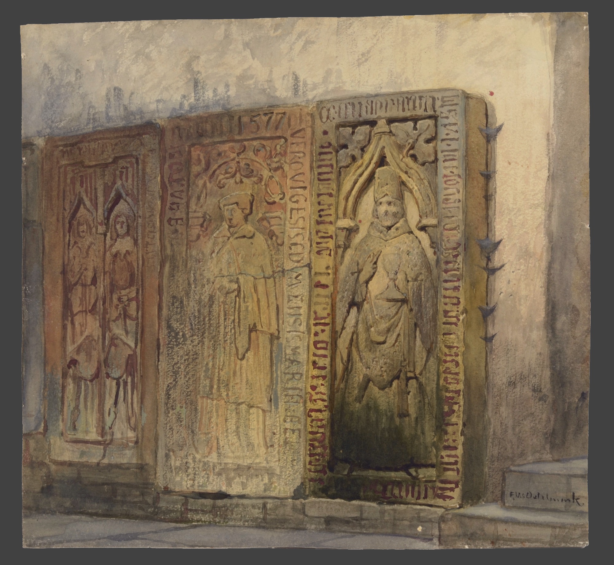 Frans Wilhelm Odelmark, Grabplatten an einer Kirchenwand, um 1870/80, Aquarell auf Papier, 33 x 36 cm, signiert, signiert unten rechts „F.W.Odelmark“, ungerahmt.