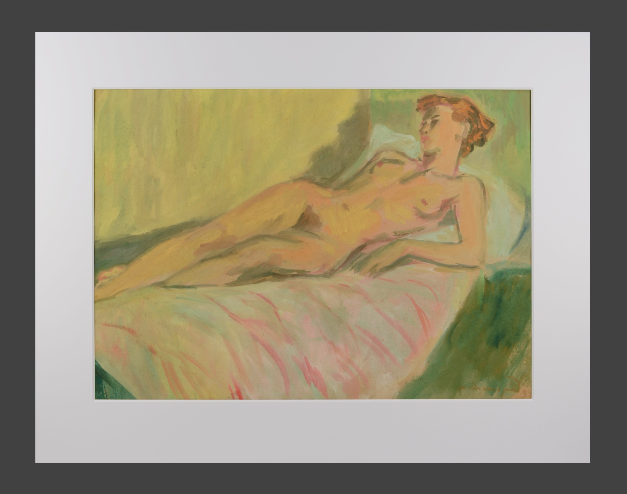 Meyer Axelrod, Female Reclining Nude, 1959, watercolor and gouache on cardboard, 52.5 x 74 cm, signed and dated lower right, handwritten inscription in Belarusian on the reverse. Condition: Pinholes in the corners and edge damage, otherwise good.