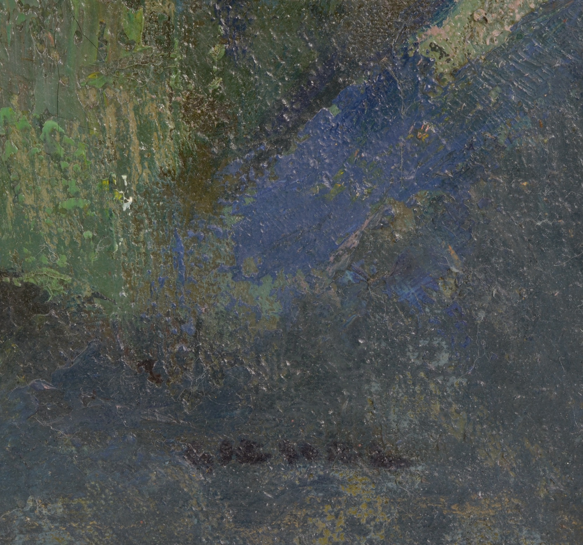 Carola Baer-von Mathes, Wiesenbach, um 1900, Öl auf Leinwand, aufgezogen auf Karton, 35.8 x 30 cm, signiert unten recht „C. Baer“, gerahmt (51 x 45 cm), auf der Rückseite Etikett der Galerie am Isartor und weitere nicht identifizierbare Bezeichnungen.